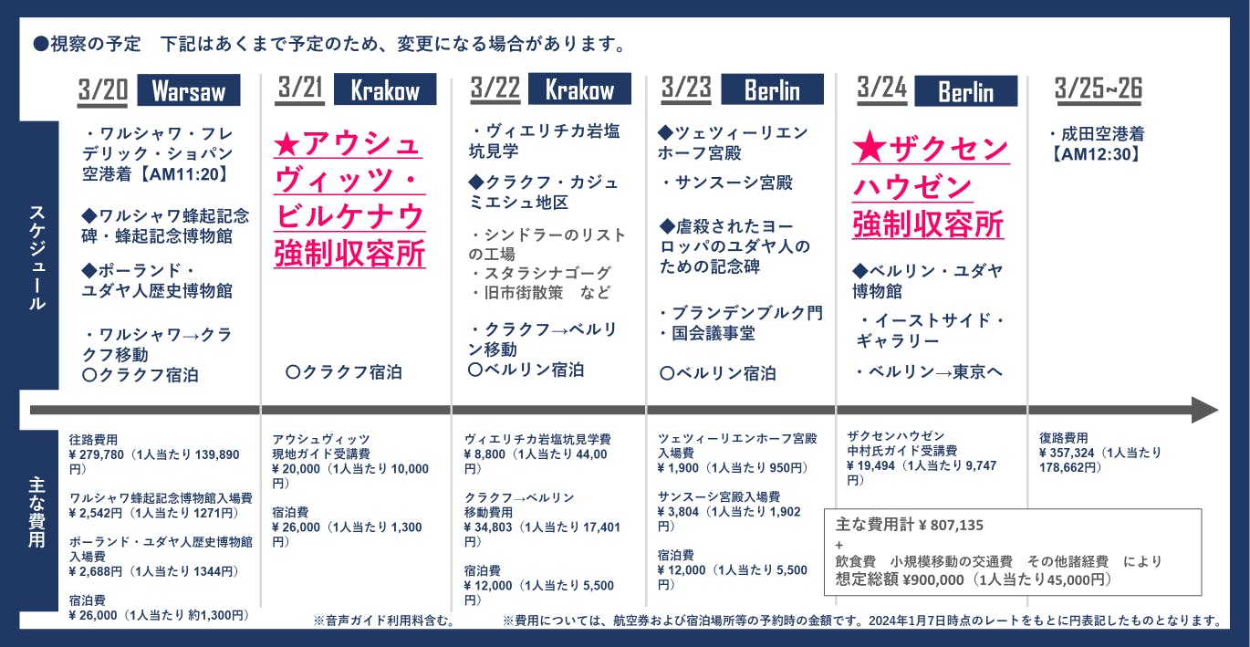 現在、僕たちは上記のような視察内容で計画しています。アウシュヴィッツ・ビルケナウ強制収容所とザクセンハウゼン強制収容所の視察を中心に、ワルシャワ、クラクフ、ベルリンの各博物館や記念碑等を巡る予定です。