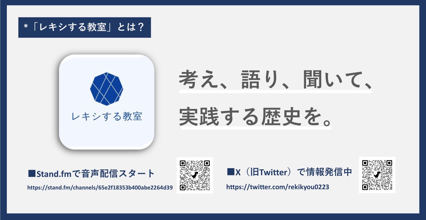 また、より気軽に、けれど深く、歴史や歴史の実践について考える時間を作れればと思い、stand.Fmで音声コンテンツの配信をスタートいたしました。長尺の1本撮り、いい意味で不真面目で、だからこそ熱く。歴史を語るのではなく、考える、そんなありそうでなかった“歴史する”番組を目指します。