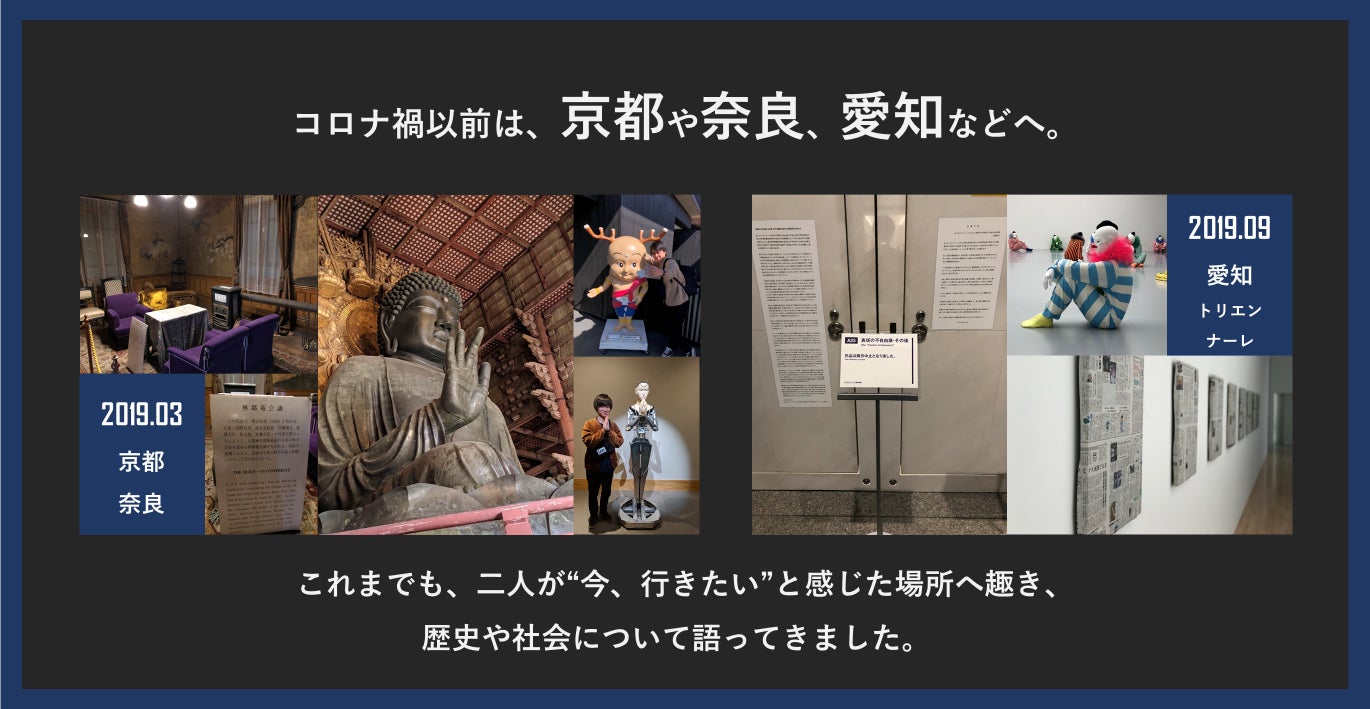 語る量が増えていくうちに関心も似てきて、「今、ここに行きたい」と思ったら自然と声を掛け合うようになりました。これまでにも、「歴史の継承」と「復興」をテーマに思索を深めに、京都と奈良へ行きました。また2019年には、当時話題になっていた「あいちトリエンナーレ」について、ネットの情報や誰かの言葉からではなく、この目で見て、考えたいという思いを共有して、愛知県へ訪問しました。今回のプロジェクトも、いつも通り二人で飲んでいる時に三塚が放った「一生に一度は必ず、アウシュヴィッツに行っておきたいんだ」という言葉から始まりました。