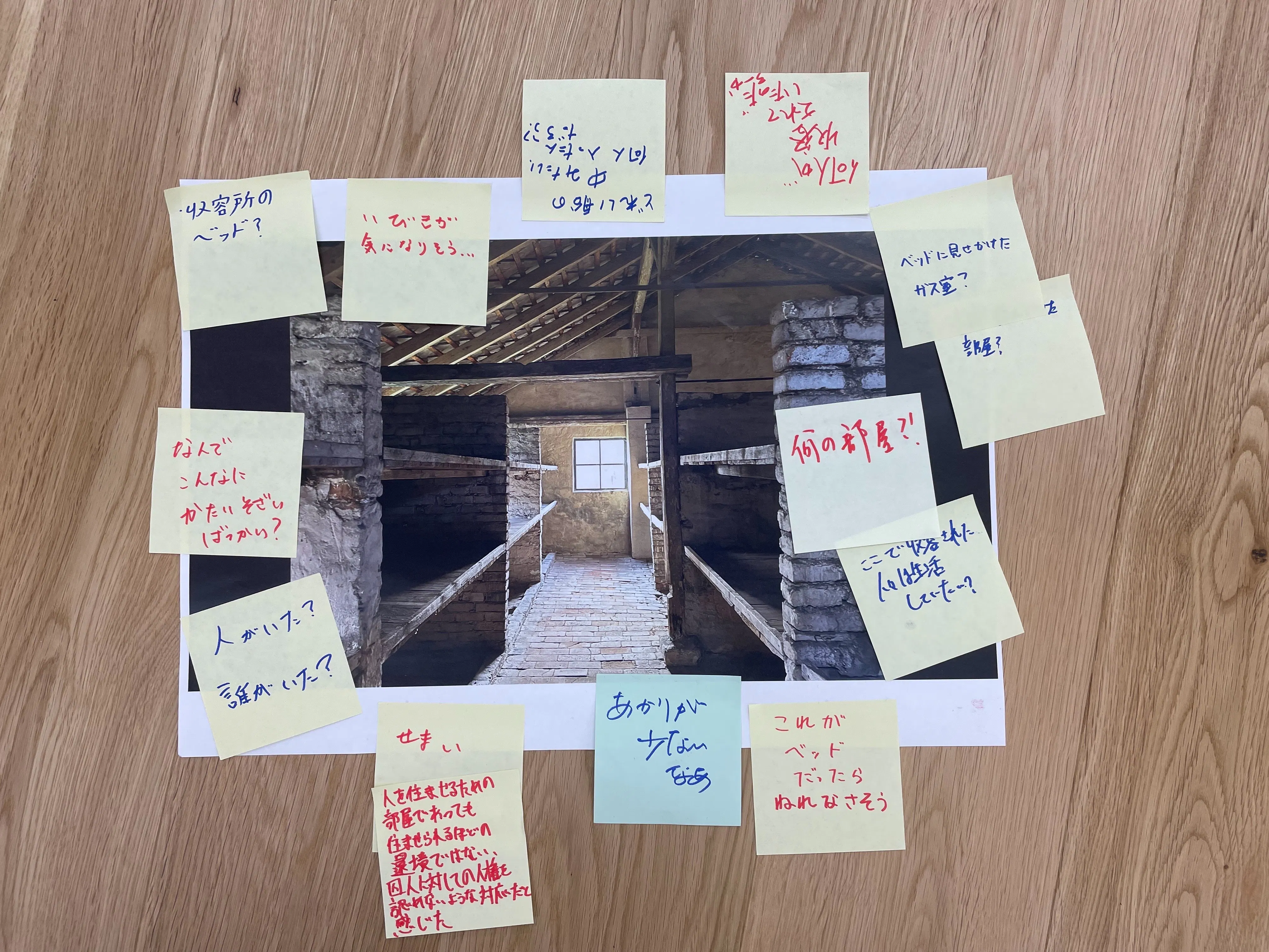 2024/07/21 19:11前回の【1.設計編】を未読の方は、そちらからお読みいただけますと幸いです。 2024年5月25日(土)、かえつ有明中学校・高等学校にて、アウシュヴィッツとホロコーストについて考える特別教室を開催しました。我々の特別教室の開催をご支援いただいた皆様、誠にありがとうございました。当日お越しいただき、ご参加いただいた皆様もありがとうございました。 前回の活動報告【1.設計編】では、我々がどのような経緯で特別教室を企画し進めていったのか、ポーランド・ドイツへ行く前と後に考え、議論したことを中心にご報告いたしました。今回は特別教室開催の2週間前から直前までの期間についてお話しします。5月12日、打ち合わせ後に話したこと 前回の続きから。ある程度の見通しがついたと感じた二人は、幾分ほっとして、飲み行こうぜ、となりました。月島のバーへ行きました。ウイスキーのソーダ割を頼みました。そんな感じで、カウンター席に二人で並んで座り、今考えていることを話し合いました。 アウシュヴィッツから帰ってきた直後は「無事行って帰ってきた」という想いが強く、実際に観て、感じ、考えたことについて互いに深く話すことを、実はあまりできていませんでした。現地にいるときは、実際に観ながら、夕ごはんを食べながら、電車に乗りながら、あらゆる時間、あらゆる場所で、ある意味我々はずっと語り合っていたとも言えます。それは即時的に、反射のような形で発露された言葉でした。今この瞬間に観て、感じたことを永遠に無かったことにしないように。 少し時間を経て、改めて自らに問うこと。我々がアウシュヴィッツへ行って考えたこととは何か。問いと対話の場をつくることが特別教室の構成的側面、もしくは教育の実践としての側面だとすれば、もうひとつ考えなければならないのは、特別教室の内容的な側面、すなわち我々は何の歴史を伝えるか(=何を語るか)というものでした。 特別教室当日使用スライドより 二人は共に似た困難にぶつかっていました。アウシュヴィッツへ行く前に我々が考えていたことに対して応答することの困難さ、果たして我々にアウシュヴィッツを語ることは可能なのか、というものでした。二人の実力不足で解にたどり着けていない、という側面も正直なところあるかもしれません。この点については今なお、解に迫ろうと試みています。二人が書くレポートと紀行文には、その痕跡が多少なりとも刻まれるものになるはずです。そうでなければならない。 他方で、それは単に「よくわかりませんでした」ではないということもお伝えしたい。我々が躓いた、ある種の解答不可能性とでも呼ぶべきものとは次のようなものでした。少し長くなります。 アウシュヴィッツへ行く前、我々は本を読み、映画を観て、アウシュヴィッツについて一定の知識を身に着けた。歴史学や哲学の思考法を取り入れながら、ある種の仮説として、「なぜ我々がアウシュヴィッツへ行くのか」「その上で、特別教室としてどうアウトプットするのか」を立てた。しかし、アウシュヴィッツの見学を経て、日本に戻り1カ月間、目の前の仕事をこなす日々の日常に回帰し、その中で僅かな時間ずつ繋ぎ合わせ、少しずつ思考してゆきながら辿り着いたのは、「僕はアウシュヴィッツの歴史について語り切れない」という根本的な無力感でした。それは、アウシュヴィッツへ行く前には語れると思っていた、あるいは実際に何かしら語ることができていたものが、アウシュヴィッツへ行ったことで却って語ることができなくなってしまった、という事態でした。 そう思わせるくらいに、アウシュヴィッツがひどく巨大な施設だったこと、その巨大さは「想像を絶するような」暴力の規模を表していたこと。何かを語ろうとする時、語ることを選択し、同時に別の何かは語らないこととして選択される、その時に零れ落ちてゆくものを見つめ、真っ直ぐに見つめ返される。アウシュヴィッツの大地を踏みしめ、青い空を見上げ、何十年と昔のその場その瞬間を「想像して」きたからこそ、本で読んだ借り物の理論や言葉を使いながら(まったくのゼロから言葉を紡がない限り、否、それが言葉である以上、初めからそれは借り物でしかありえない)、現地で観てきたことをあたかも自分たちの思想のように語ることに、抵抗を覚えたのです。それは本当に、ひどく無力感を覚えるものでした。焦りも感じました。歴史とは何であったか。 我々が行く前に考えていたこと、実際に行った上で応答しようと試みたお題は宙づり状態となり、代わりに我々は、この「言葉にできない」「語ることができない」ことについて、アウシュヴィッツへ実際に訪れたからこそ得た感覚として伝えることにしました。 その是非は、特別教室の開催当日を迎えるまで幾度も我々のもとに到来し、論点となりました。一方では、我々が実際にアウシュヴィッツへ行ったからこそ考え至っ