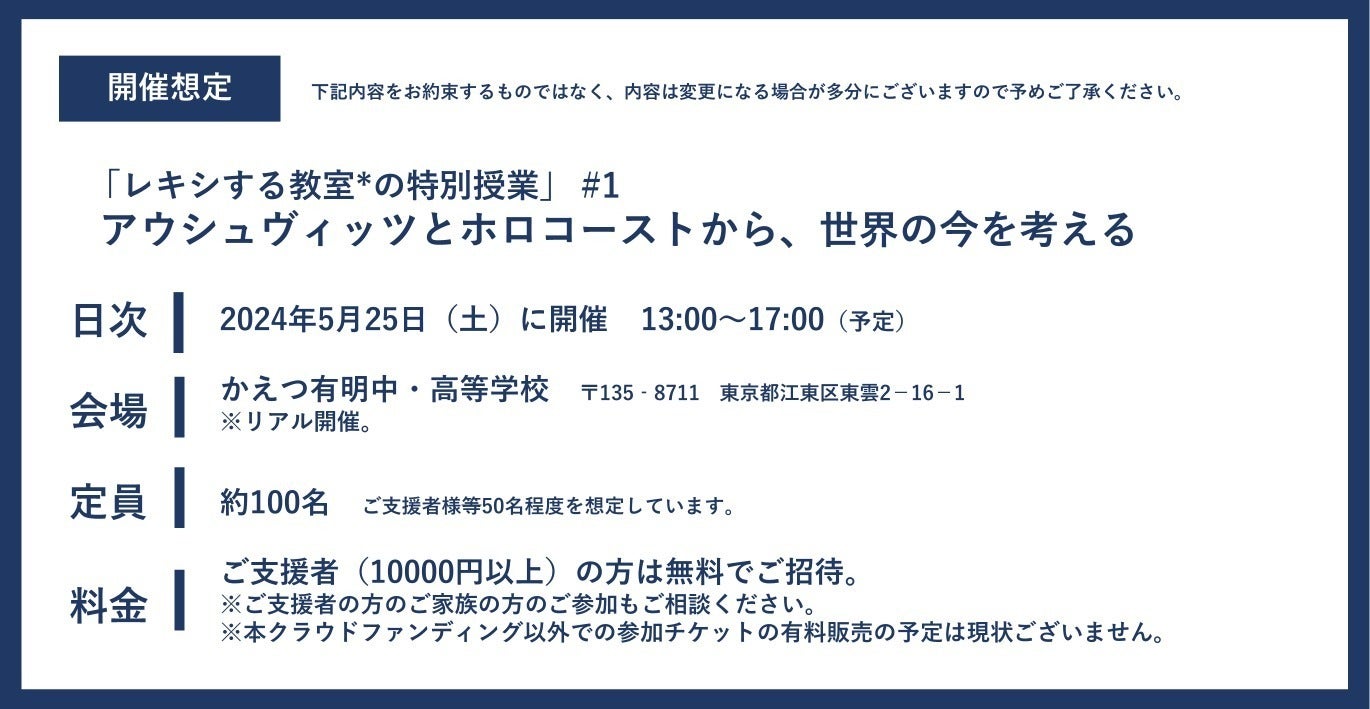 歴史をともに学び、考える場を企画するプロジェクトとして、本クラウドファンディンを皮切りにスタート。その上で「レキシする教室の特別授業#1」と位置づけして、ホロコーストの特別教室を開催します。頻繁開催は現実的ではないですが、第2回、第3回、とシリーズ化を目指します。