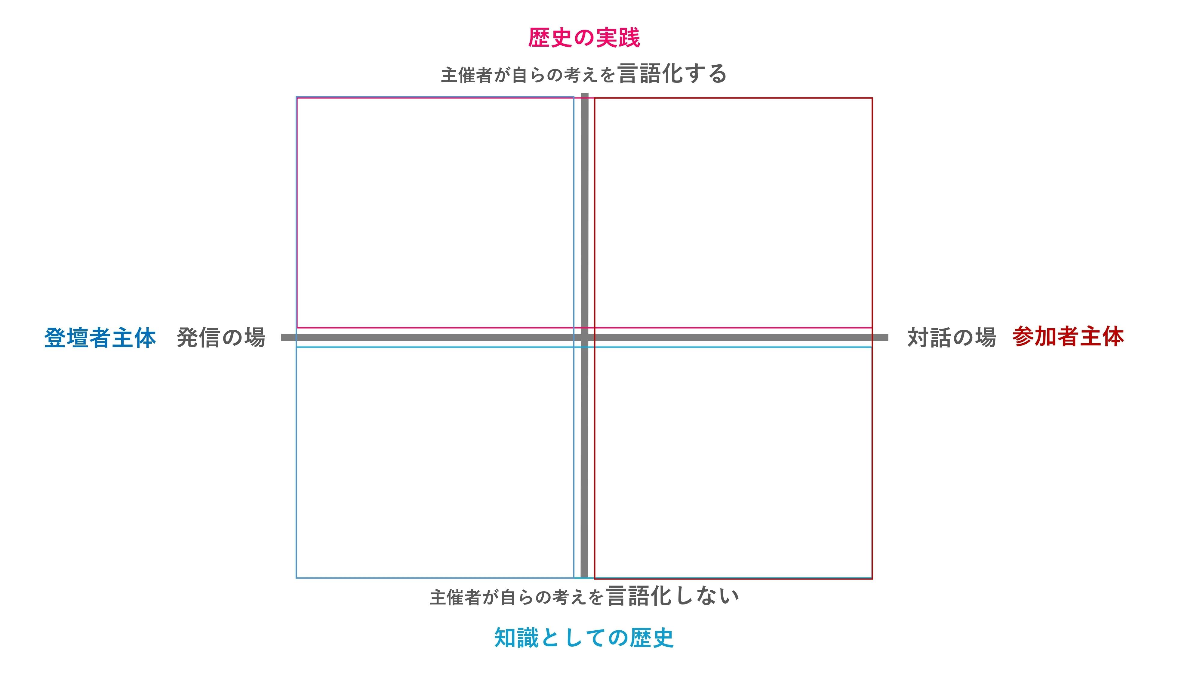 歴史について自らの考えを言語化し、対話の場をつくる。右上の象限こそが、我々が考える特別教室の理想と言えるでしょう。
