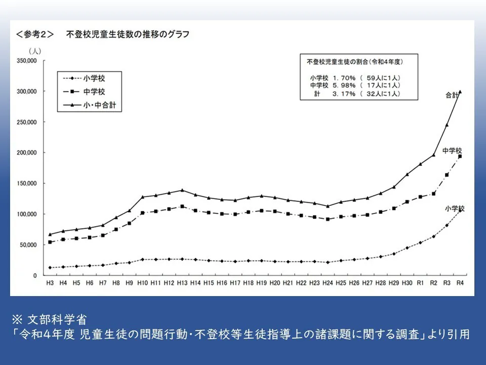 文部科学省による「令和4年度 児童生徒の問題行動・不登校等生徒指導上の諸課題に関する調査」によると、小・中学校における不登校児童生徒数は約30万人となっており、前年に比べて5万人以上の増加となっています。また、不登校児の約4割が学校内外の専門機関に相談しておらず、孤立しています。京都府内には不登校により長期欠席している小中学生が5,627名(令和4年度データ)いるとのことです。