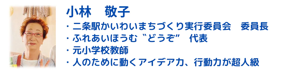 私たちは、京都の二条駅周辺で、10年以上にわたり、絵本の読み語り会や、子ども食堂などの子育て支援をはじめとする地域活動を続けている任意団体「二条駅かいわいまちづくり実行委員会」のメンバーです。