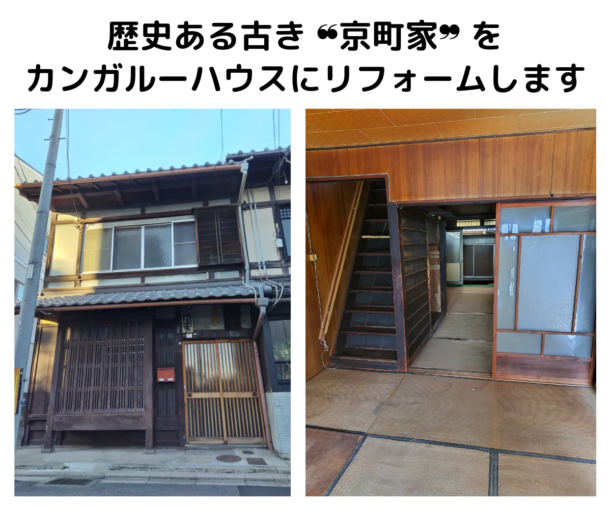 カンガルーハウスとなる物件は、築年数不詳の2階建ての古い京町家です。しばらく空き家となっていたため、床が抜けていたり、階段が壊れたりしていました。耐震性や電気配線についても、安全性を向上させる工事が必要であることが判明しました。
