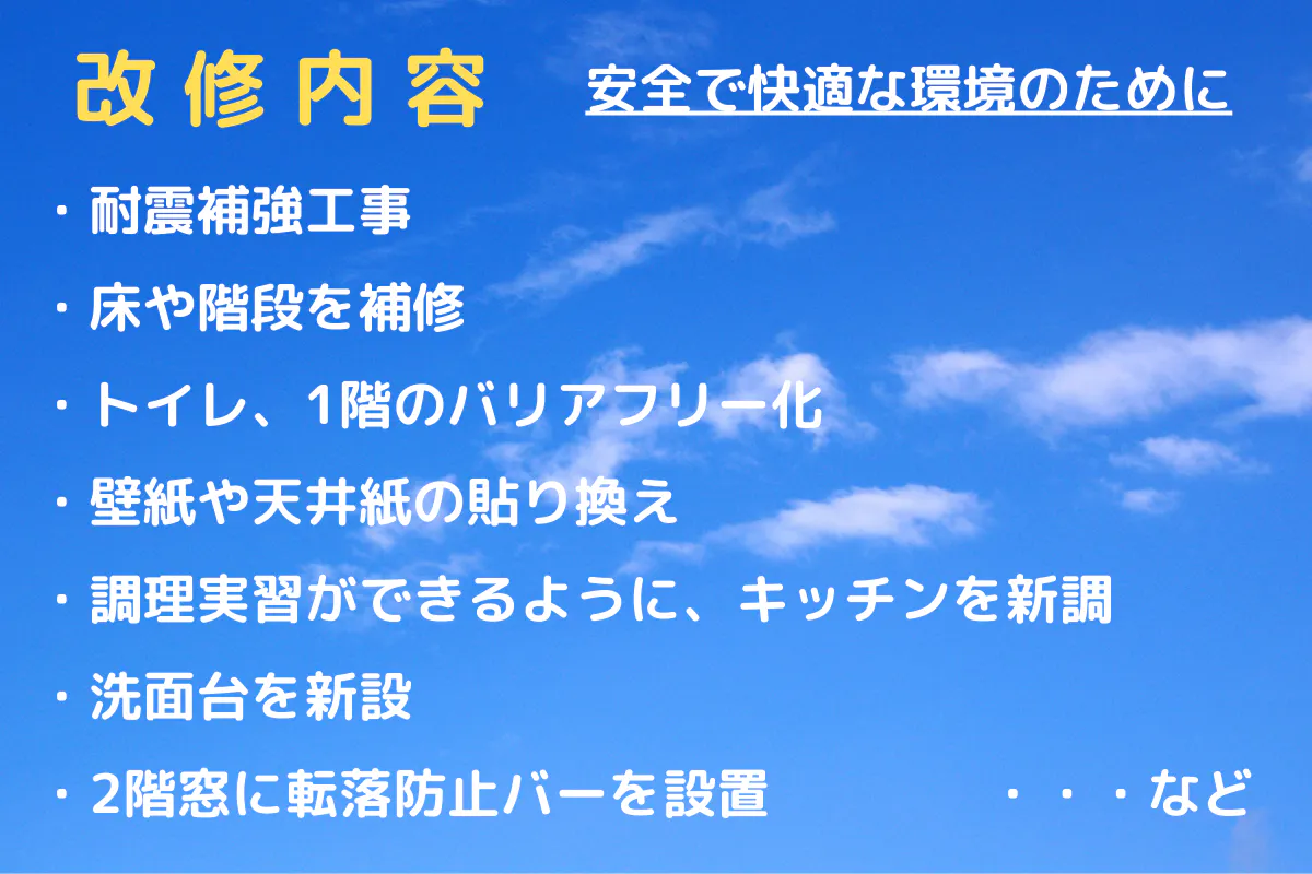 子どもたちが安全に快適に過ごせるように、次のような改修にとりかかっています。