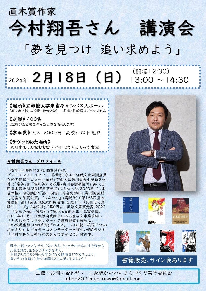 明日は、「二条駅かいわいまちづくり実行委員会」主催で、直木賞作家の今村翔吾さんの講演会を開催します。カンガルーハウスも実行委員会のメンバーで、今村さんの秘書さんとやり取りをしています。チラシも作成しました。(今村さんは滋賀の方なので、琵琶湖ブルー、『湖上の空』をイメージして、水色ベースに)