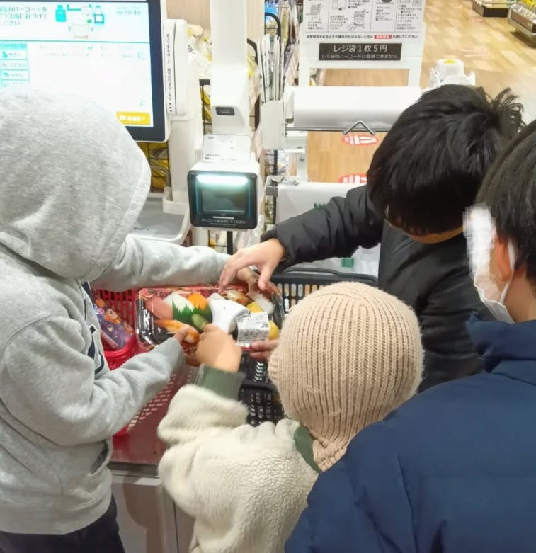 ↓セルフレジで、1年生にピっ!とさせてあげている上級生。優しいです。色んな力が育まれています。