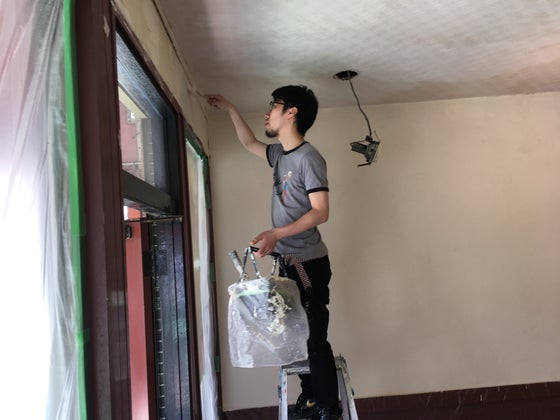 そして、塗装作業を開始!!天井はあえて壁紙を残し、「もはやこんなデザインないよ。笑」 と言われたこの怪しげな模様にヤニどめを塗り白く塗装します。