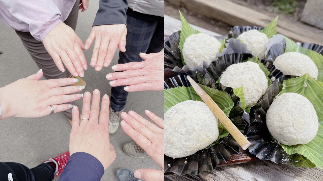 金時山山頂ではご褒美スイーツとして道明寺で作ったきな粉もちを振る舞いました。