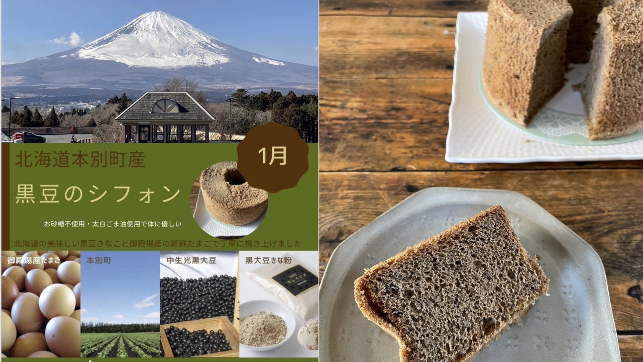 御殿場市のこだわり推奨品にも認定されている『大豆100%アスリートシフォン』は高たんぱくで、低カロリー、乾いた喉にも通りやすい、大豆とは思えないふわふわなシフォンケーキです。