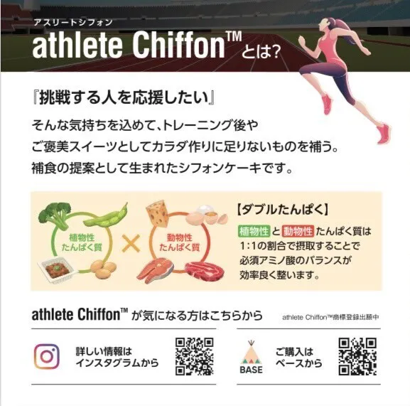 カラダが資本のアスリートのために開発したシフォンケーキを中心に、運動をされている方や、