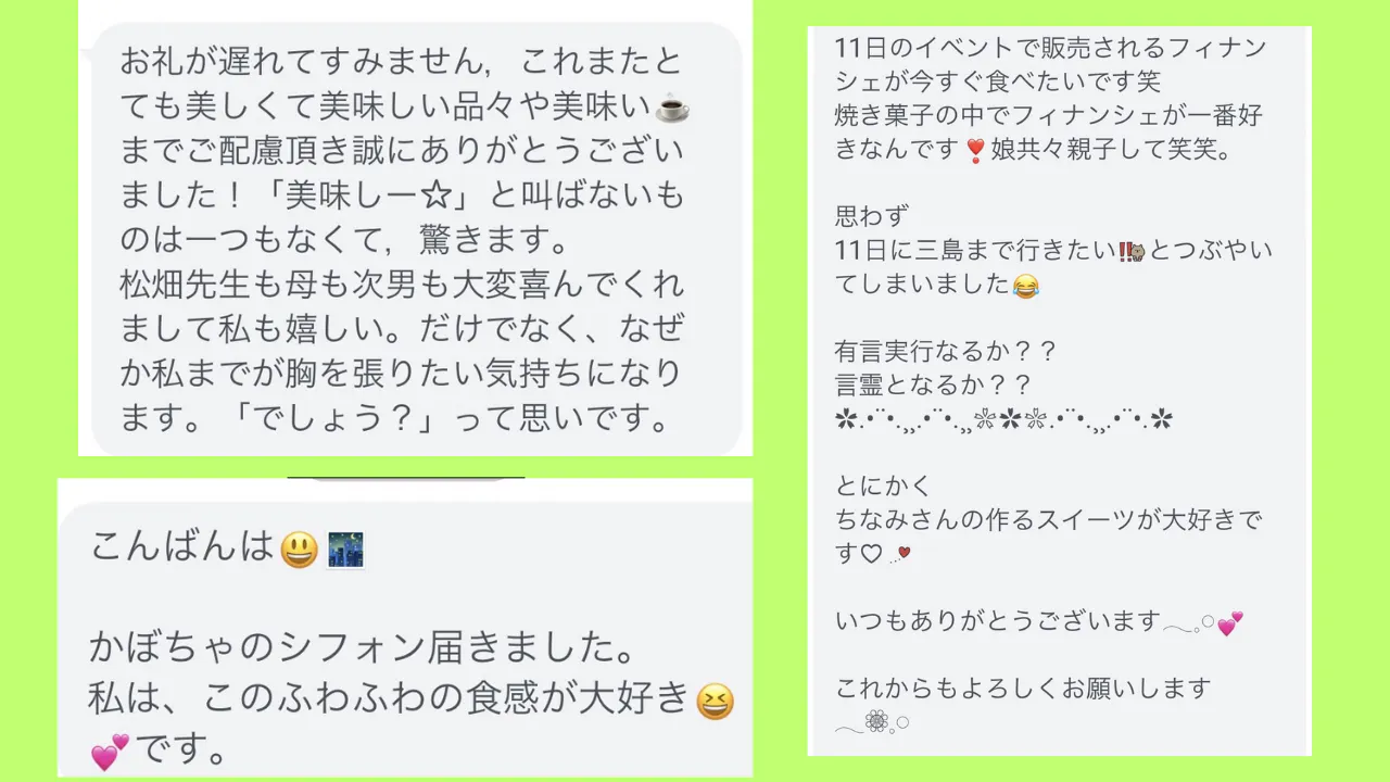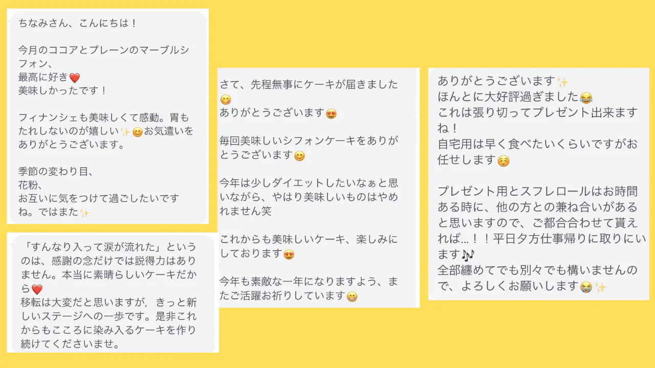 そんな時に、マンスリーシフォン(サブスク)のお客様から「他のスイーツはもう食べられません」とか「智奈美さんのスイーツだから毎月食べたいんです」など、涙が出てくるようなメールやお言葉を頂くのです。