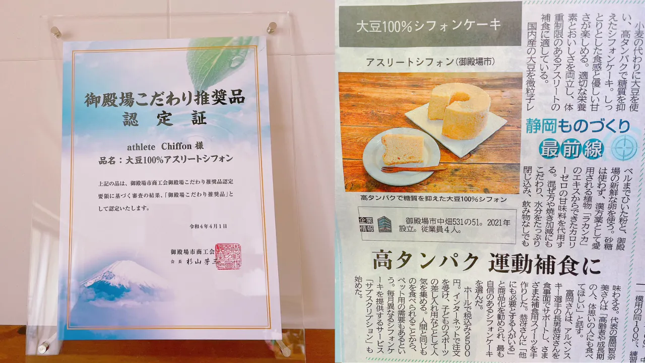 御殿場市のこだわり推奨品にも認定されている『大豆100%アスリートシフォン』は高たんぱくで、低カロリー、乾いた喉にも通りやすい、大豆とは思えないふわふわなシフォンケーキです。