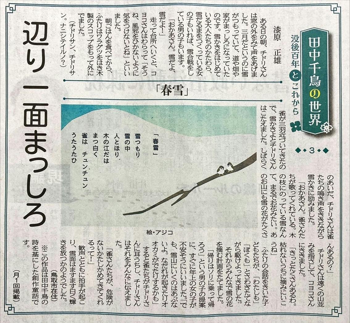 漆原正雄さんの創作童話【春雪】(「田中千鳥の世界 没後百年とこれから」第3回)が2024年3月17日日本海新聞文化欄に載りました。