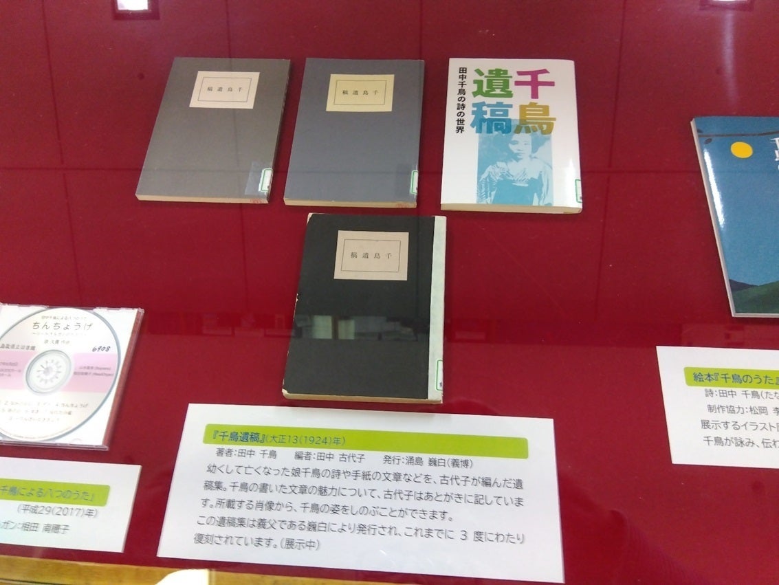 県下で横断展示中の絵本原画展が、東部鳥取市に戻ってきました。2024年5月15日~6月12日まで、鳥取県立図書館二階 ギャラリーで開催中です。20点のイラスト原画とともに、シューケースには『千鳥遺稿』の初版本、母:田中古代子の著作集など図書館所蔵の貴重本・関連資料などがズラリと並ぶ充実した展示です。