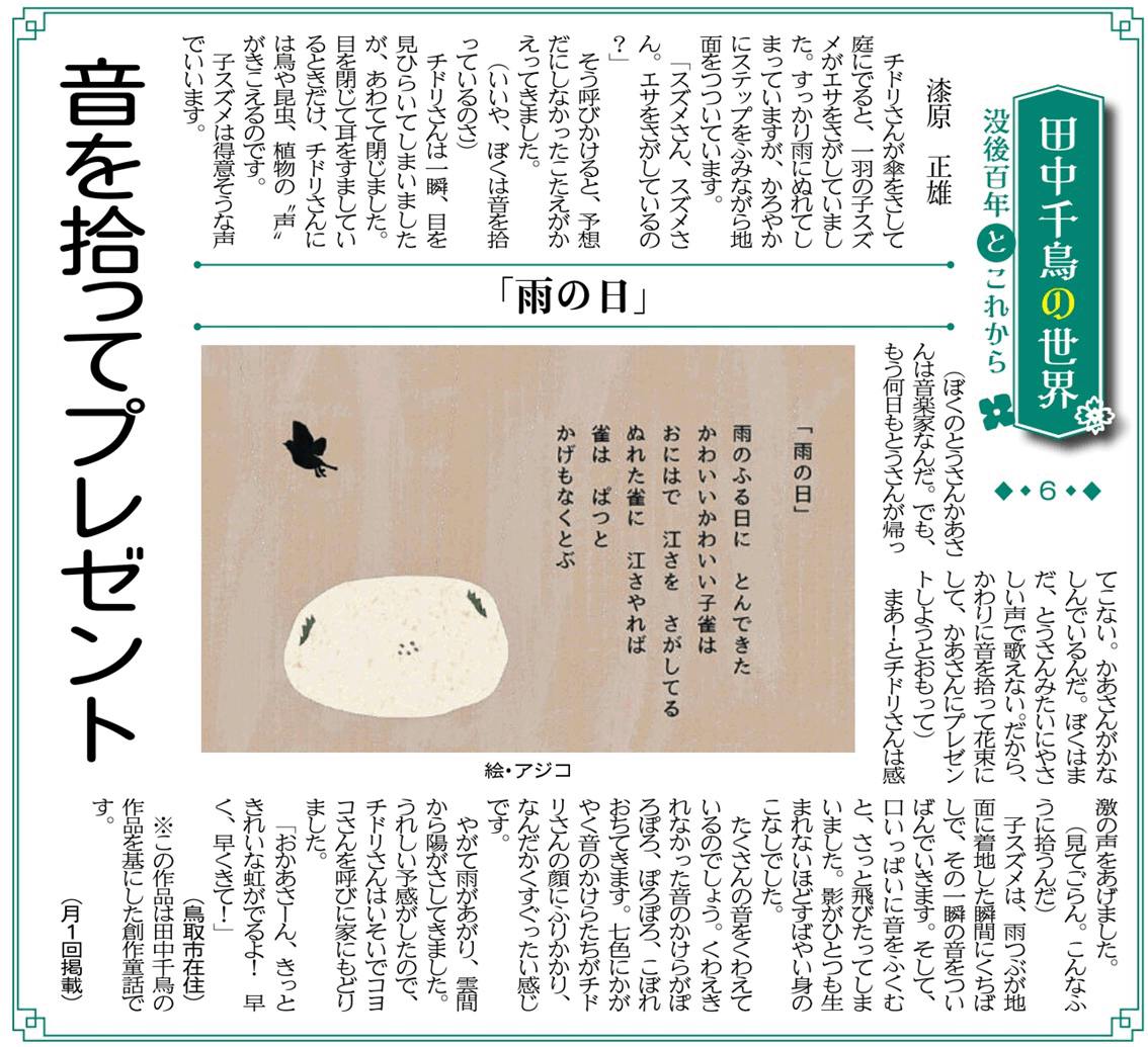 漆原正雄さん(千鳥百年プロジェクト メンバー)の創作童話【雨の日】(「田中千鳥の世界 没後百年とこれから」第6回)が2024年6月16日 日本海新聞文化欄に載りました。