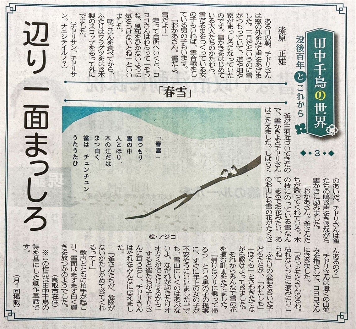 漆原正雄さんの創作童話【春雪】(「田中千鳥の世界 没後百年とこれから」第3回)が2024年3月17日日本海新聞文化欄に載りました。