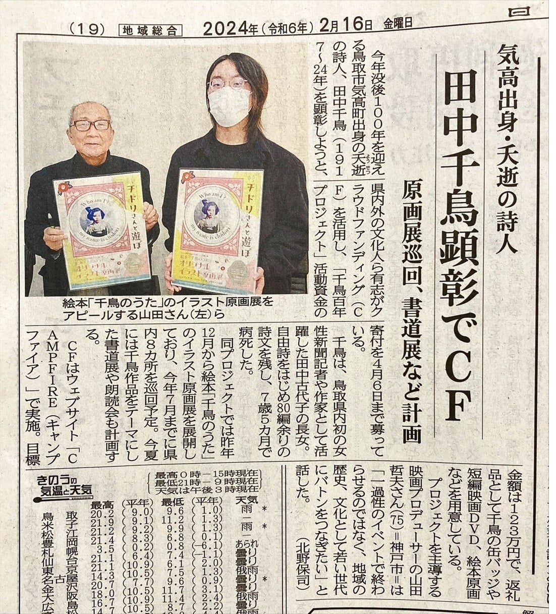 2024年2月16日鳥取県下シェアNo.1の日本海新聞さんがクラウドファンディングの記事を書いてくださいました。感謝!