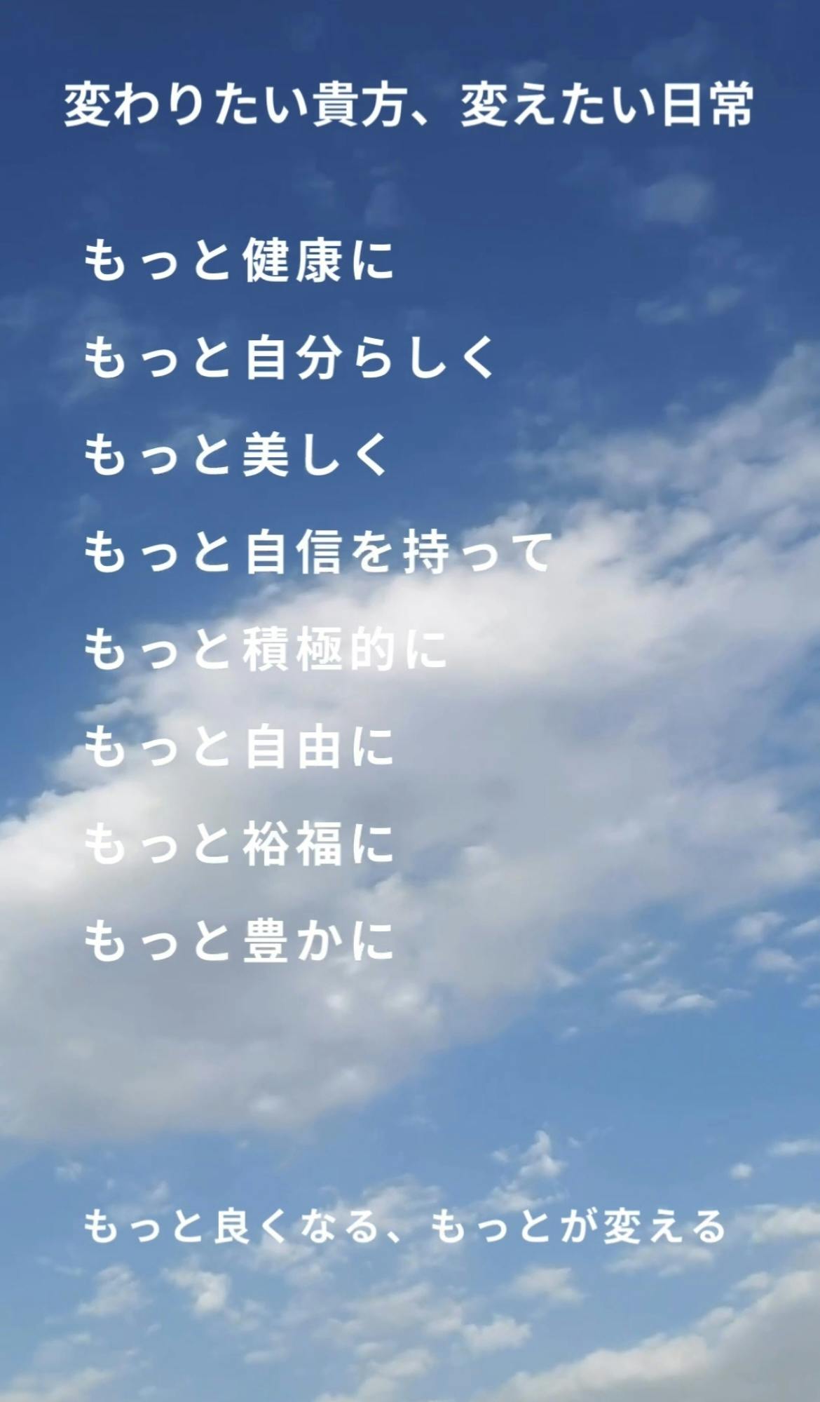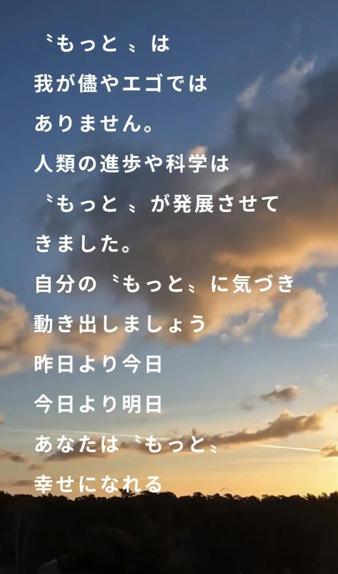 自分を信じて自身の為に、常に良い選択を選べる様な「思考」と「心」を育てて、誰もが自分自身の「もっと」を叶える事の出来る社会にしたいと思うようになり、自分自身の成長や変化を実現するためのメソッドを創りました。オンライン講座として提供することで、より多くの人々に「もっとの実現へ」導かせて頂きたいと考えています。