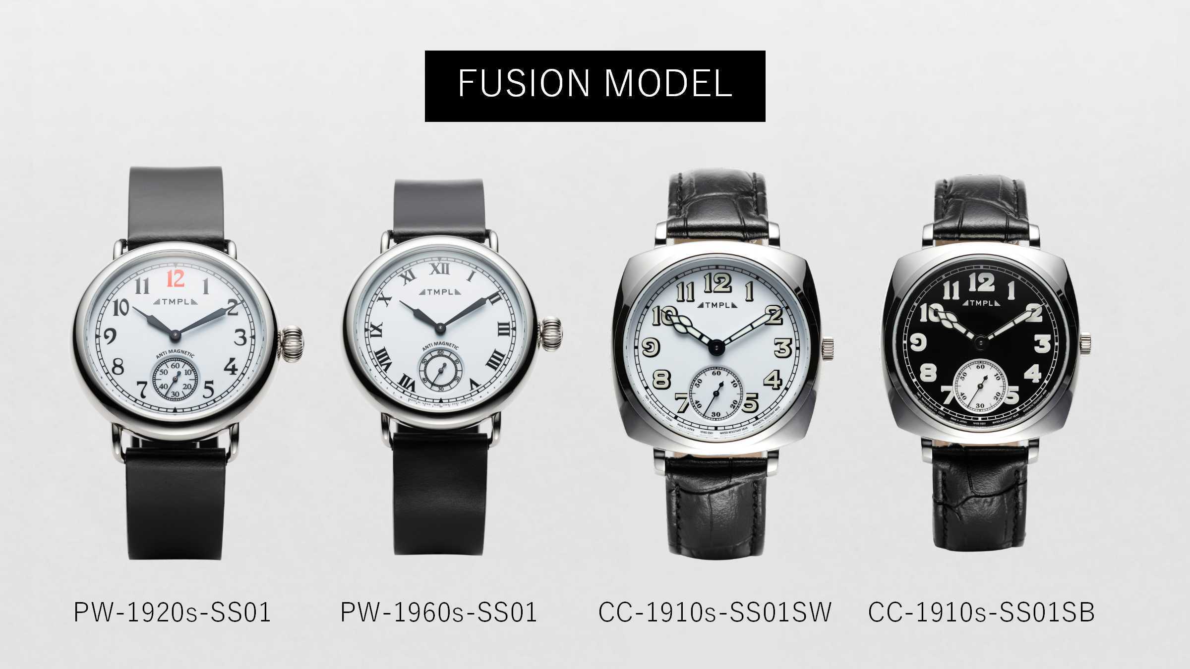 FUSION MODELは、FIRST MODELとSECOND MODELの文字盤・針・ケースのデザインをミックスしたTMPLブランド3作目のモデルです。各時代のウォッチデザインの特徴と魅力が融合した、懐かしくも新しいデザインの腕時計になっています。