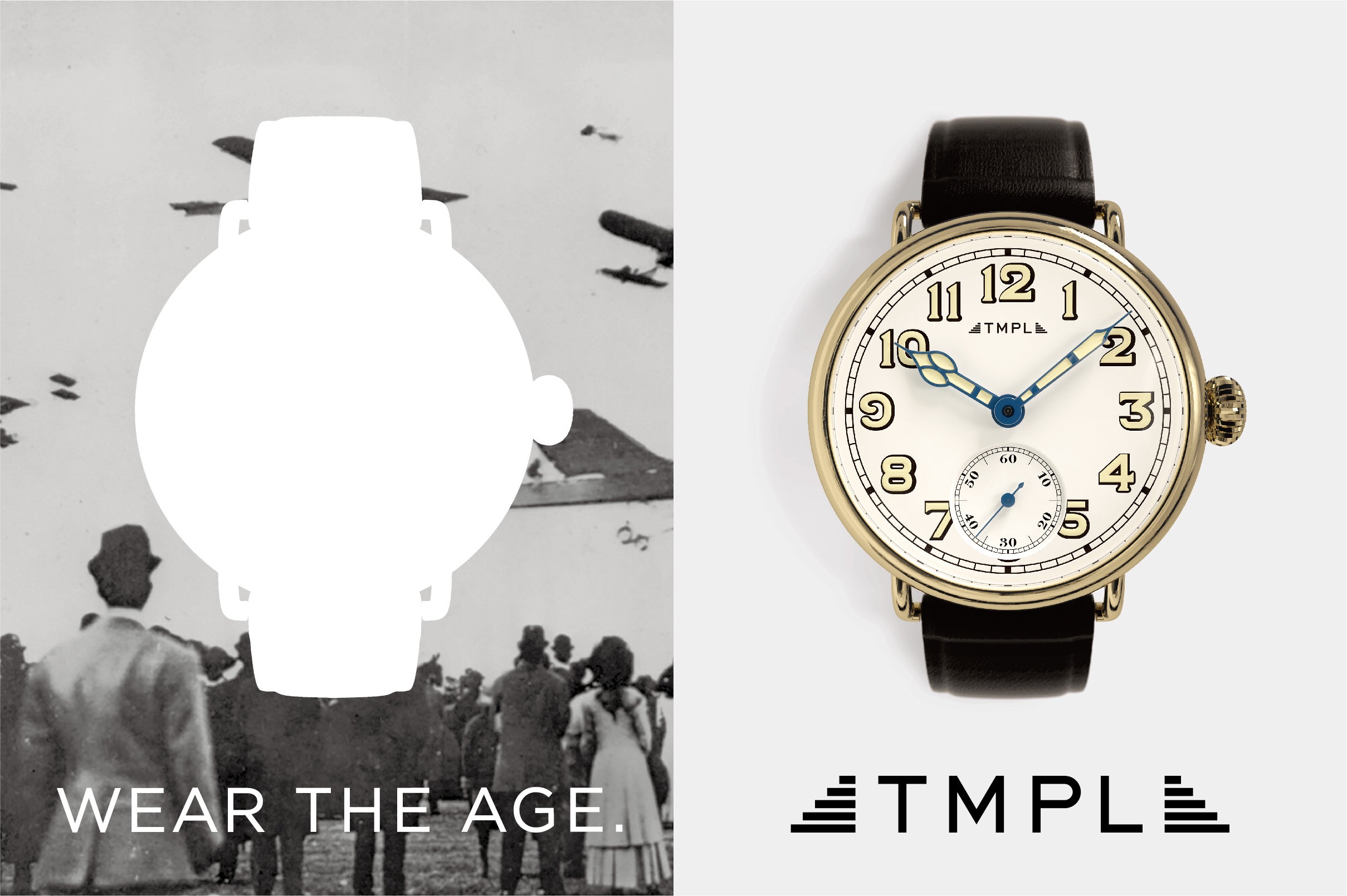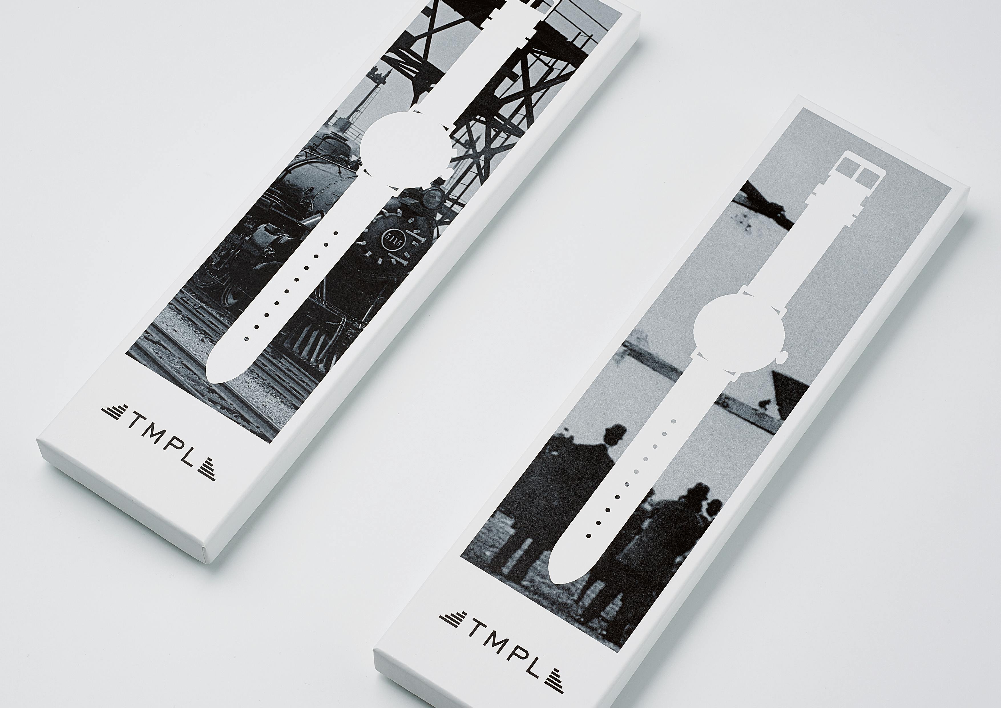 上質な白のケースに印刷した1910年代当時の写真及び1920年代/1960年代をイメージしたイラストを、TMPLウォッチのシルエットで白く抜いたデザインです。パッケージでも「WEAR THE AGE.」を体現しました。