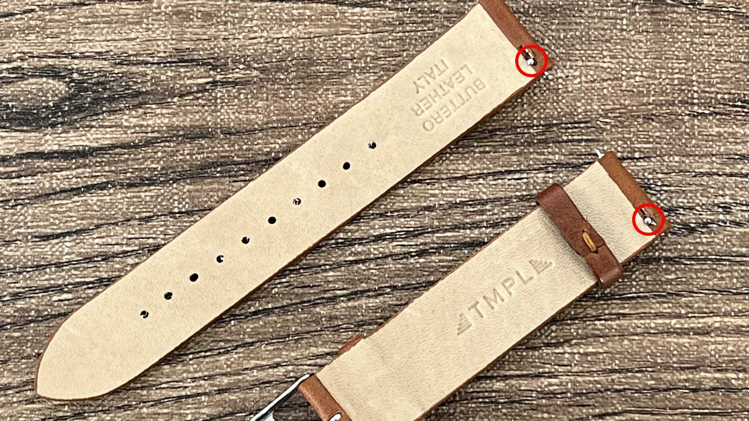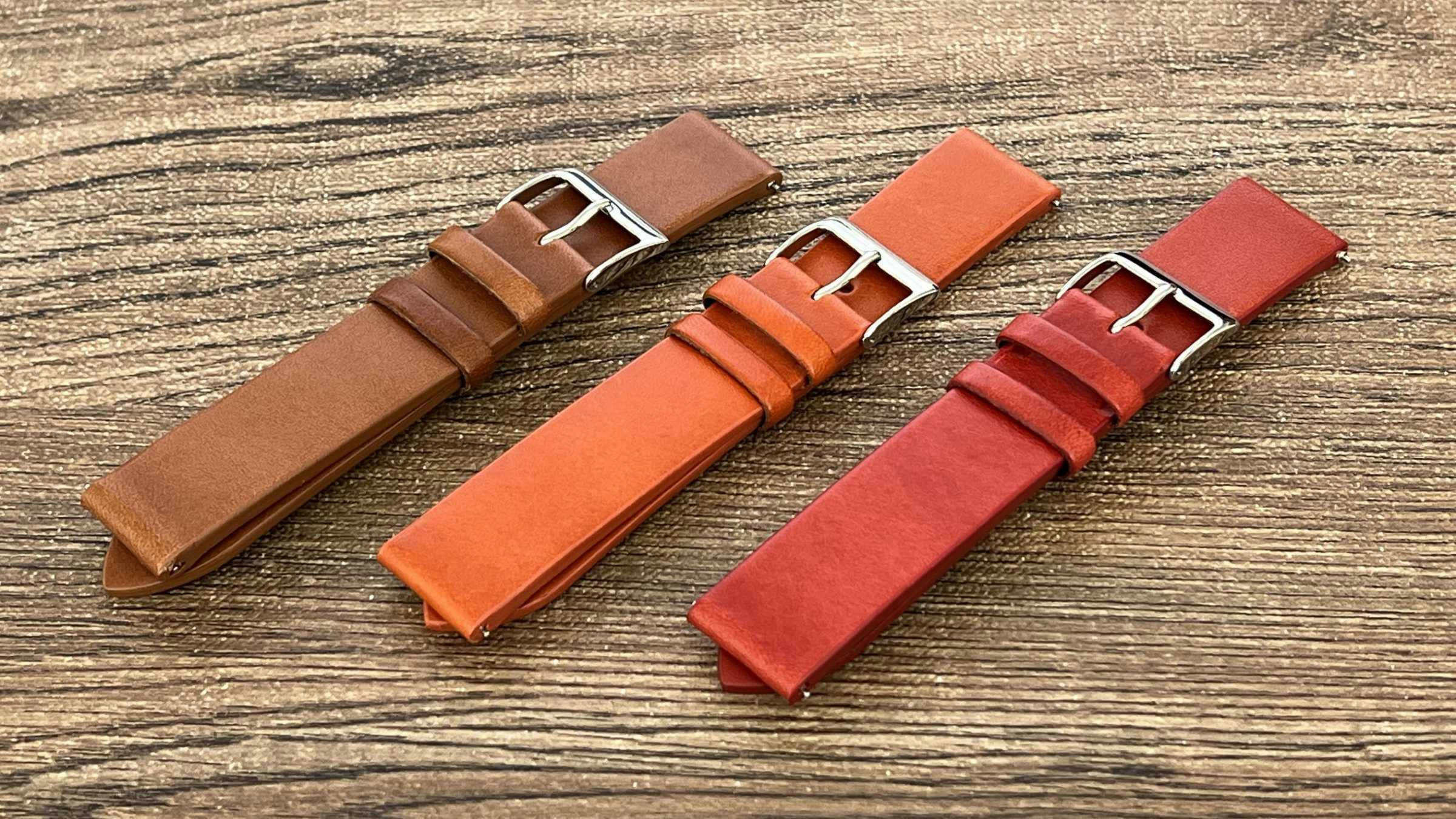 ブッテーロレザーを使用したカラーストラップは、レッド・オレンジ・ブラウンの3色展開。