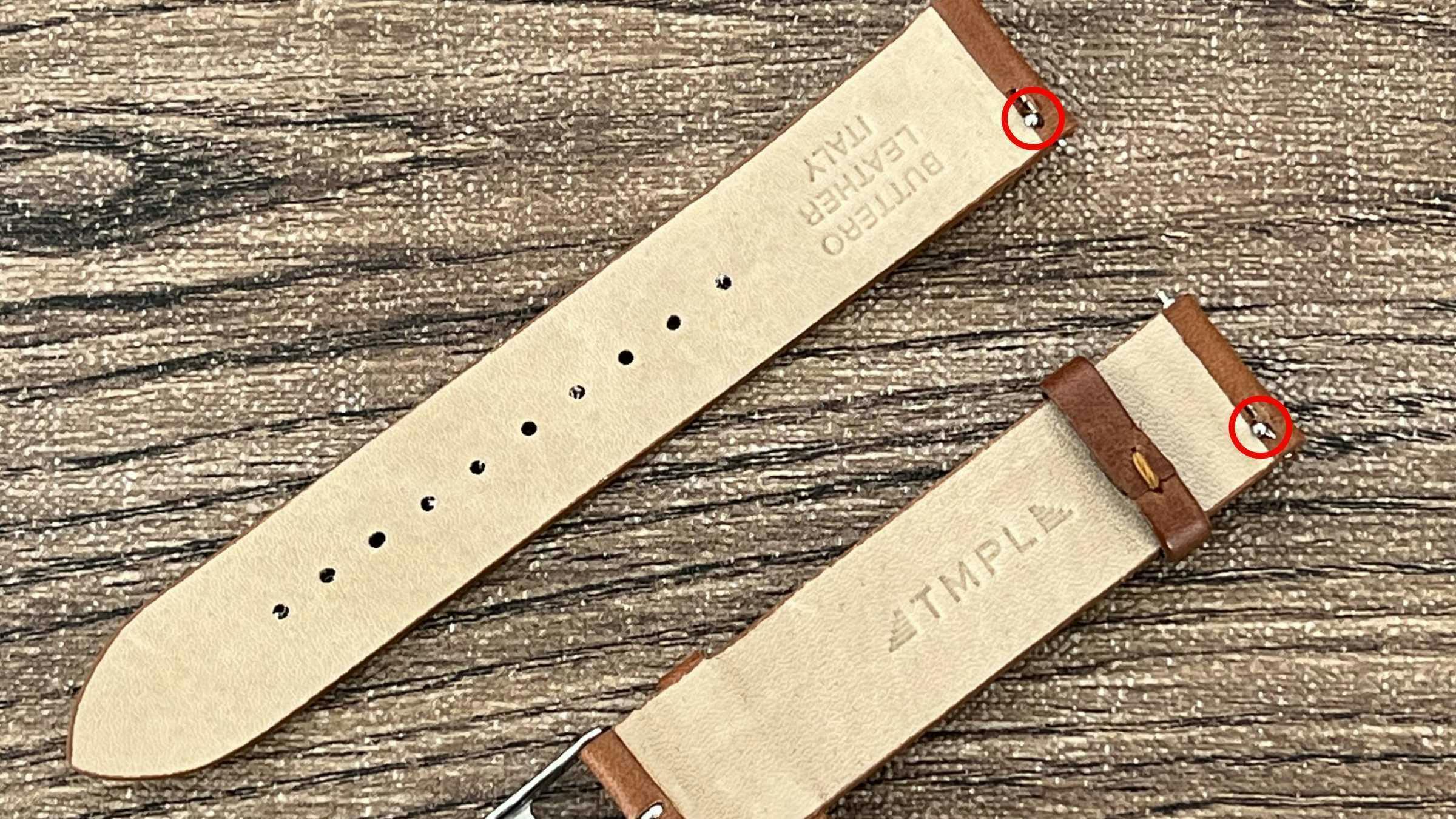 時計に付属の黒色のベルトと交換用ベルトはどちらもワンタッチレバー付きのバネ棒を採用しており、ベルト裏のレバーをスライドさせることで工具不要でどなたでも簡単にベルト交換が可能となっております。