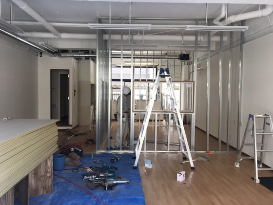 手前の広いスペースが「プレイルーム」、壁の中が「レッスンルーム」になります。