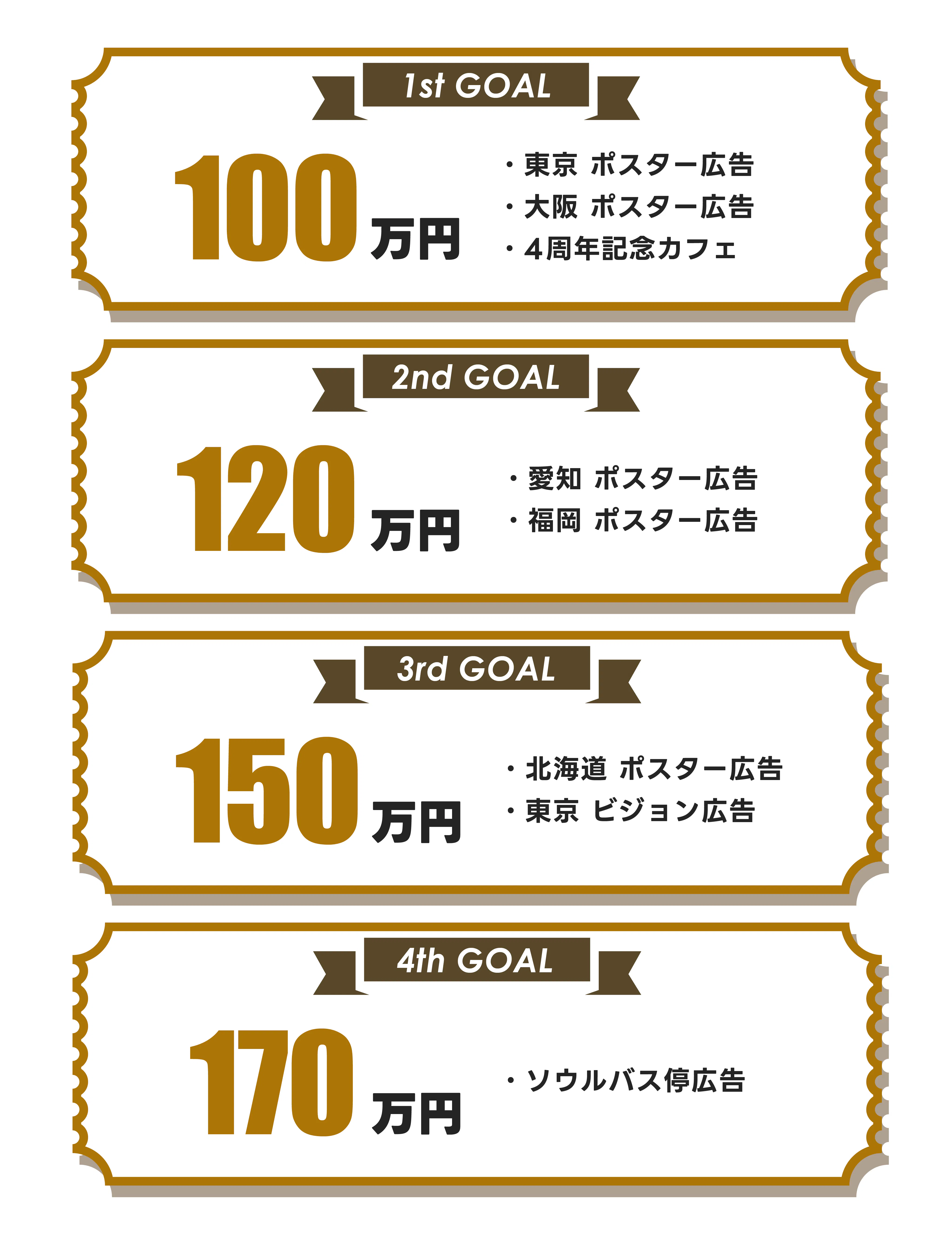 ・また、今回の企画では以下の画像のように目標金額の100万円を1st GOALとし、全部で4つの目標金額を設定し、それぞれの目標金額を達成するごとに掲載する広告を増やしていく予定です。