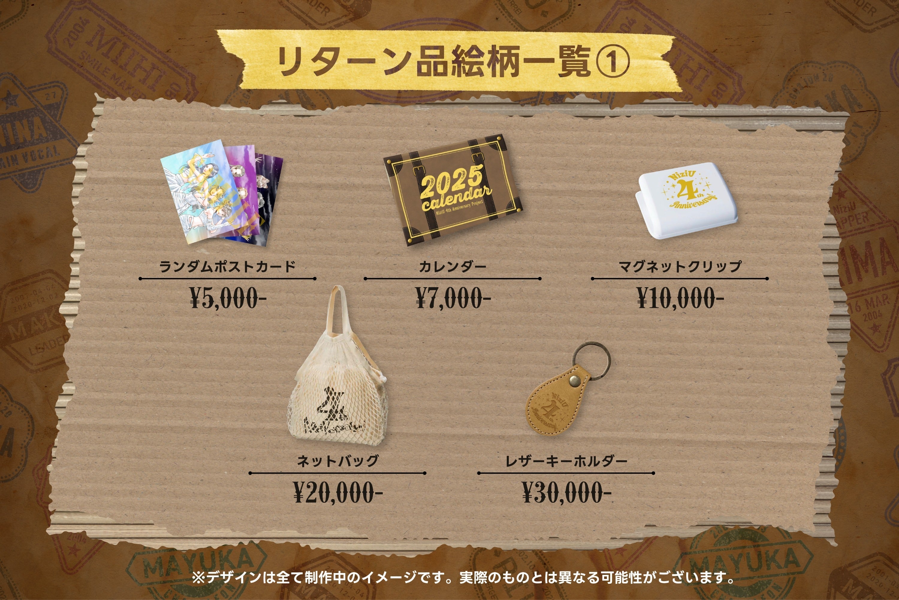 ・リターン品イメージにつきましては、随時更新予定ですが、こちらのページは反映に時間がかかる可能性があるため、リアルタイムで確認をしたい方はこちら( X/旧Twitterへ遷移いたします)よりご確認をお願いいたします。
