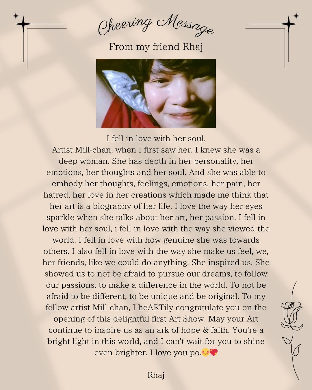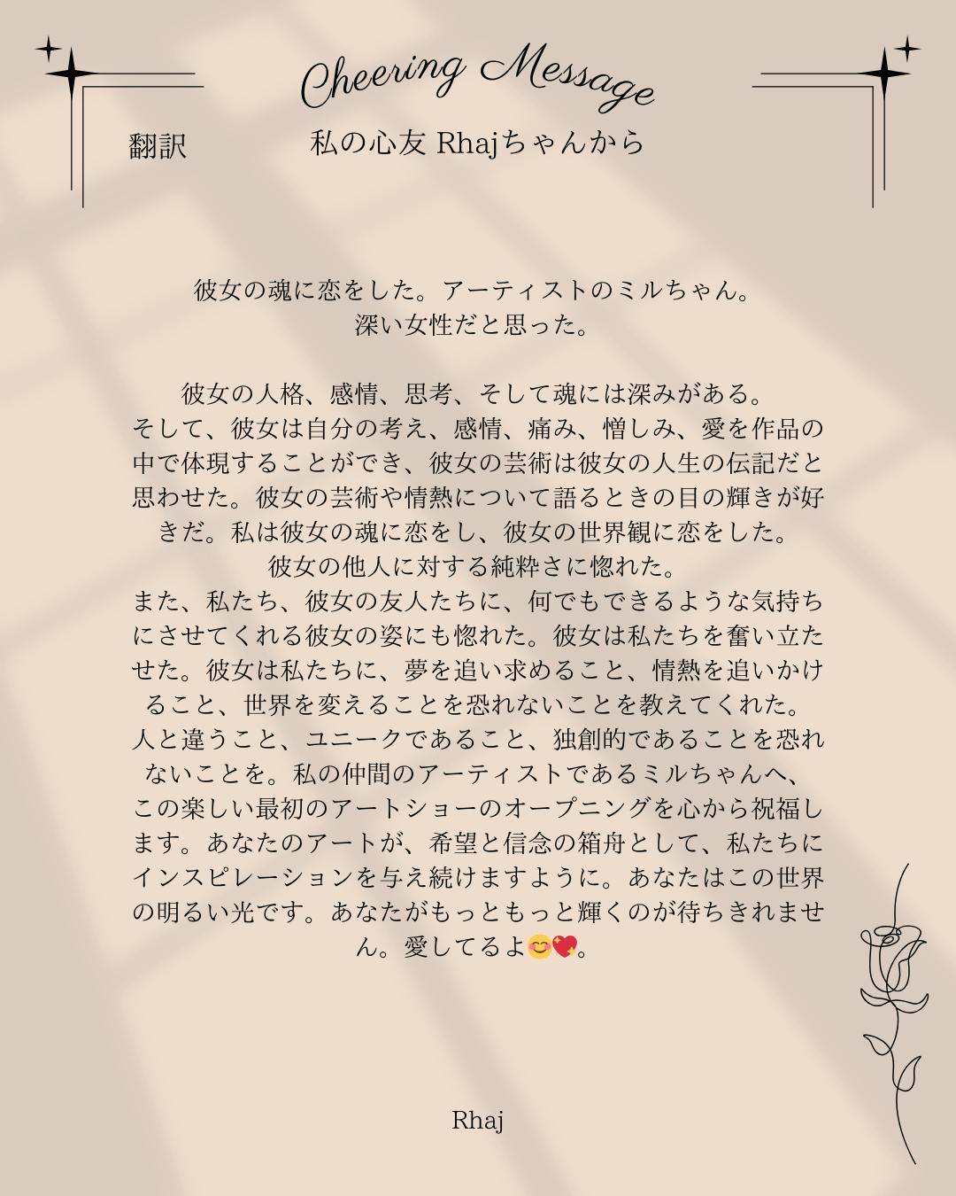 私の友人の画家Rhaj(insta→rhaj1023)が私に送ってくれた言葉です(※翻訳版)。このCAMPFIREのアプリの文章をスクリーンショットして彼は翻訳し、私の背景を知ろうと努力してくれました。