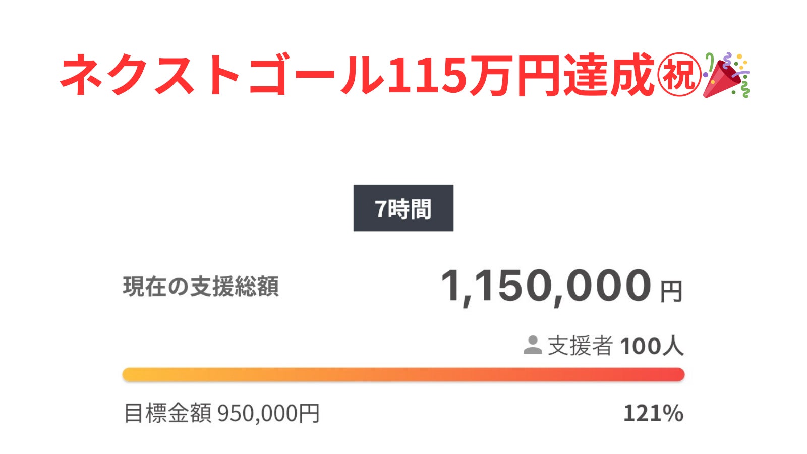遂にネクストゴール115万円を達成しました!えええええぇぇえええ!偶然にも支援者様第1人目と第100人目をkentapoさんが飾ってくださいました!kentapoさんは本文の応援メッセージでも私を紹介してくださった方です(将来は絵本作家を目指している同じアーティストさんです!)。ぜひこれを機にもう一度応援メッセージを読んでみてください!というわけで、皆さんクラッカーの準備をお願いいたします!MILL NADESHICO初個展「昔の自分を迎えに行く」にて応接間を3日間借りることと全ての支援者様のIDを模造紙に書いて個展会場に貼ることが決定しましたー!!!!やったぁ!皆様2ヶ月という長い期間ご協力本当にありがとうございました。まだクラウドファンディング完全終了まで7時間あります。最後まで皆さんで盛り上げて行きましょう!これから終了までの7時間は、こちらの活動報告やInstagram、Xにてご紹介できていなかったメッセージや感謝の言葉、活動の裏側などを投稿していきたいと思います。みなさんありがとう!!!!