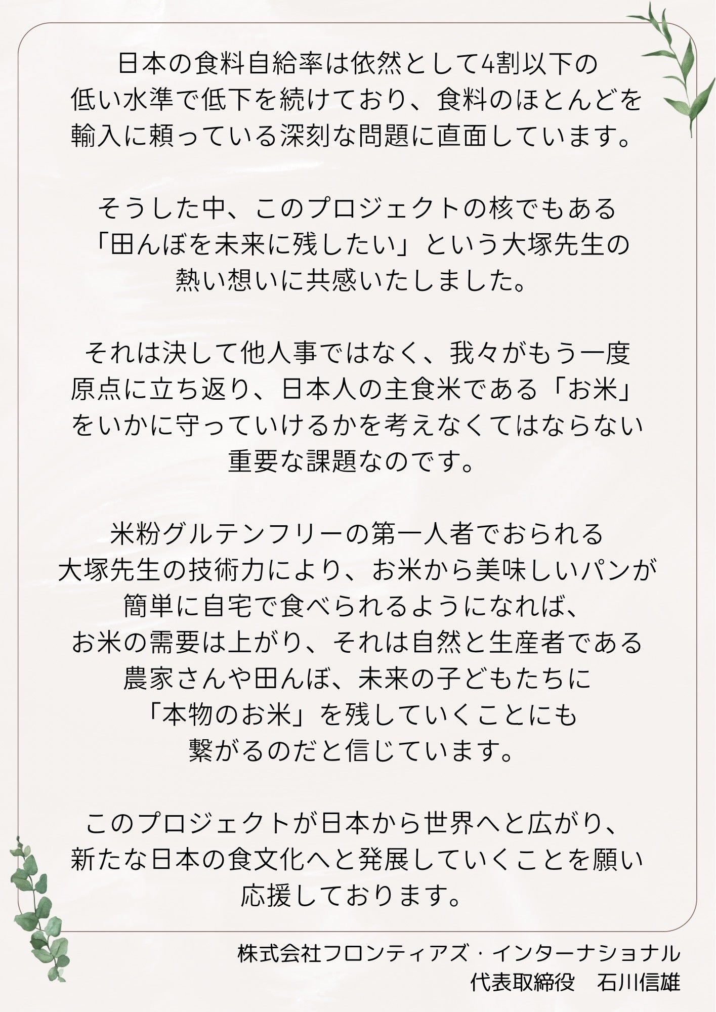 これからを担っていく若者や未来の子供たちに「食は命であり、食べることは生きることである」ということを伝え、実感してもらうべく、米農家さんたちとも協力して、もっと身近に・もっと簡単に、限りなく失敗しないグルテンフリーのお米パンで、世界中の「食」を豊かにしたい。