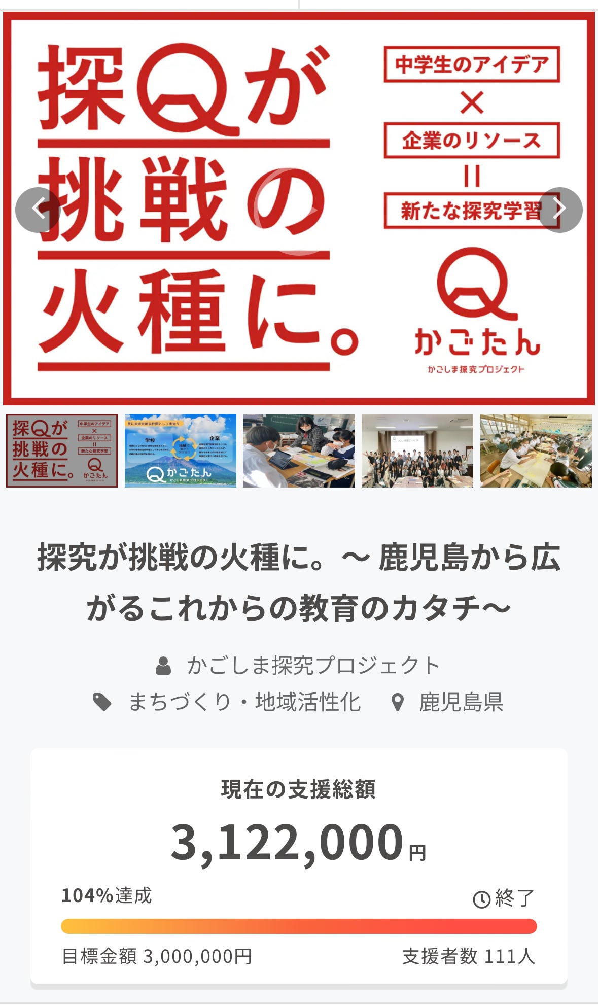 2月16日(金)から4月7日(日)50日間におきまして、3,122,000円/111人のみなさまにご支援いただきました。