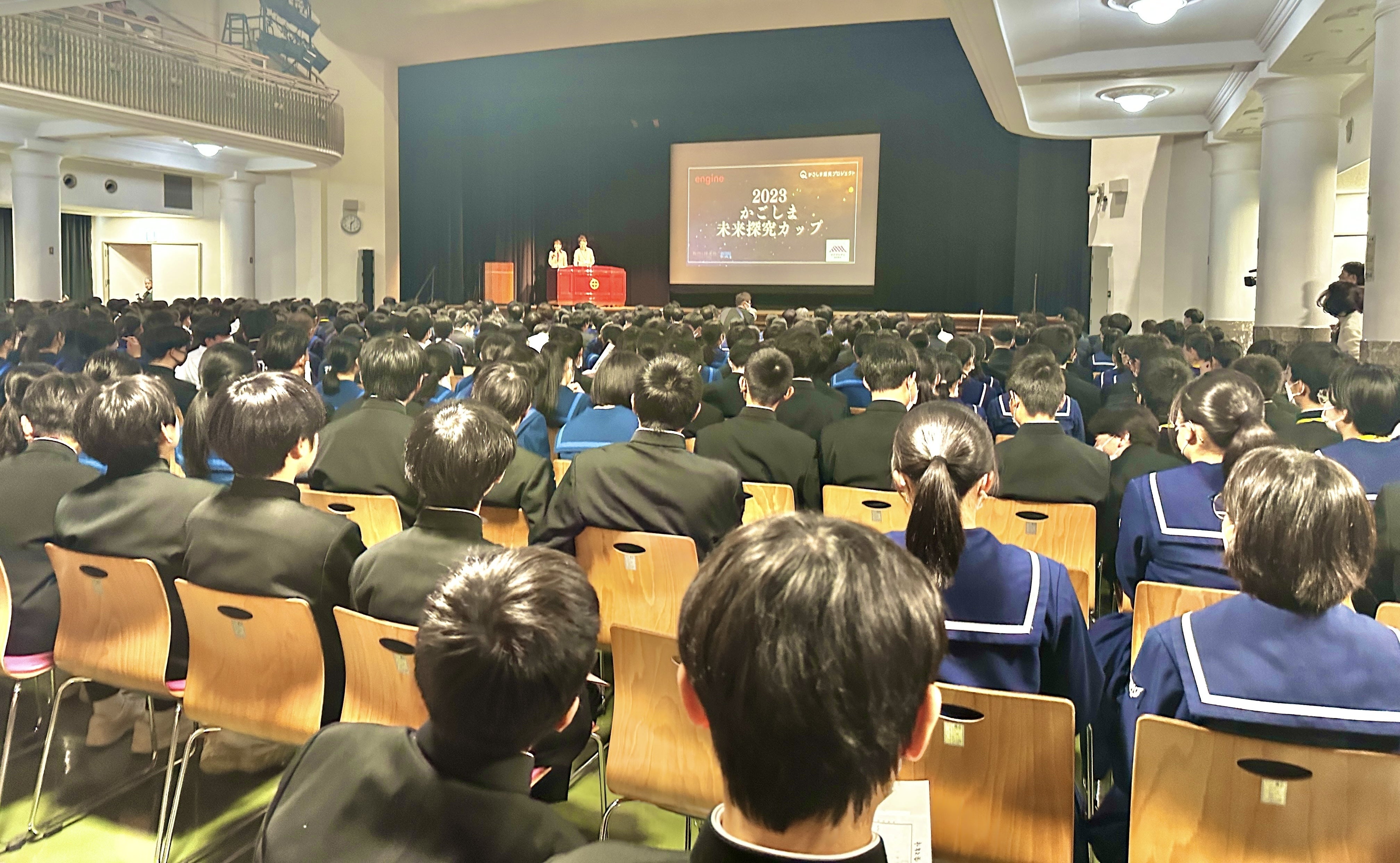 そして今年度(2023年度)は、県内から本プロジェクトに参加したいと手を挙げた中学校5校、生徒約800名と、12社の企業が参画してくださり、プロジェクトを実施することができました。12月末には初の「かごしま未来探究カップ」(通称:かごたんカップ)を開催。参画した学校・企業が一堂に会し、それぞれの学校から選ばれた代表チームが全員の前で発表を行いました。