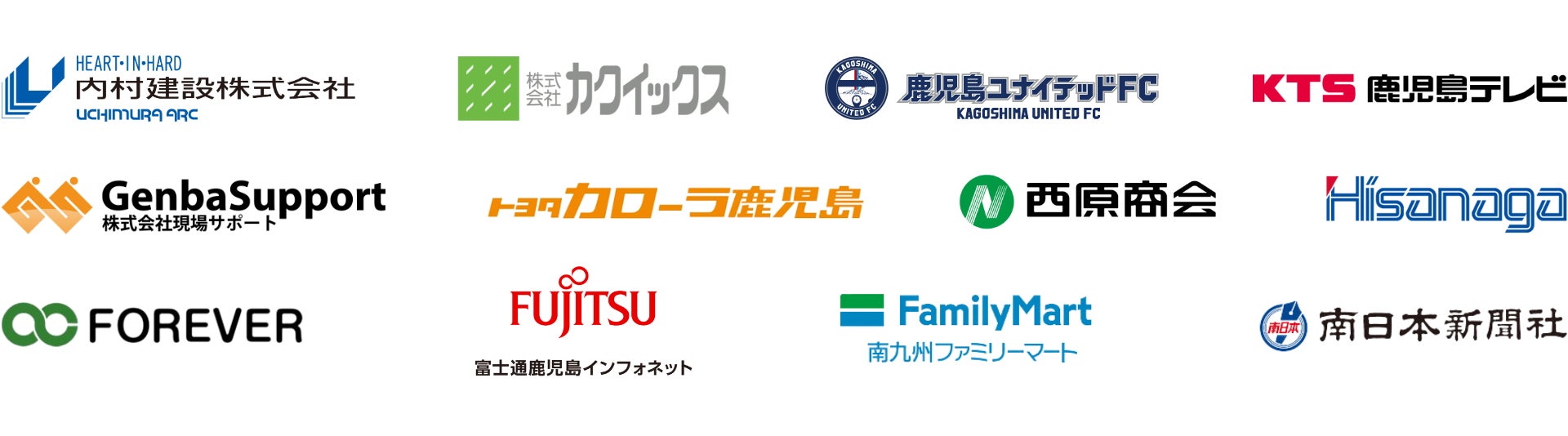 ◆企業名:内村建設 / カクイックス / 鹿児島ユナイテッドFC / KTS 鹿児島テレビ / 現場サポート / トヨタカローラ鹿児島 / 西原商会 / 久永 / フォーエバー / 富士通鹿児島インフォネット / 南九州ファミリーマート / 南日本新聞社(敬称略・五十音順)