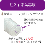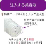特徴的な形状をした、ほぼ無痛の突起(ホローマイクロニードル)を化粧品容器の先端に付けています。この突起極細の針(φ100μm、高さ200μm)を肌の内部にまで差し込み、バリア機能を減らした状態で直接美容液を肌に注ぎ込むため、塗るより浸透が促されると期待されています。自分で使えるノック式の無痛針ですので、日々の使用に気軽にお使いいただけます。