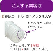 特徴的な形状をした、ほぼ無痛の突起(ホローマイクロニードル)を化粧品容器の先端に付けています。この突起極細の針(φ100μm、高さ200μm)を肌の内部にまで差し込み、バリア機能を減らした状態で直接美容液を肌に注ぎ込むため、塗るより浸透が促されると期待されています。自分で使えるノック式の無痛針ですので、日々の使用に気軽にお使いいただけます。