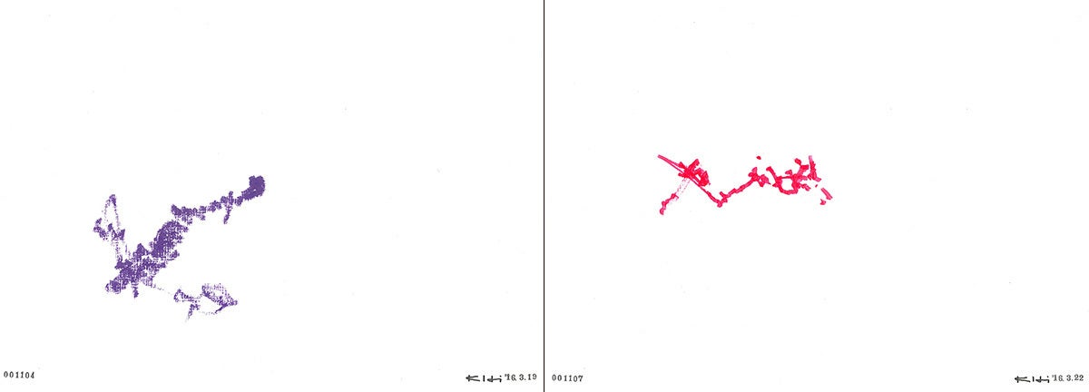 毎日の就寝前に曜日ごとに色を変えたペンを手に括り付け、熟睡すると同時に創作が始まるアートワーク「寝画/In-Sleep Drawing」。