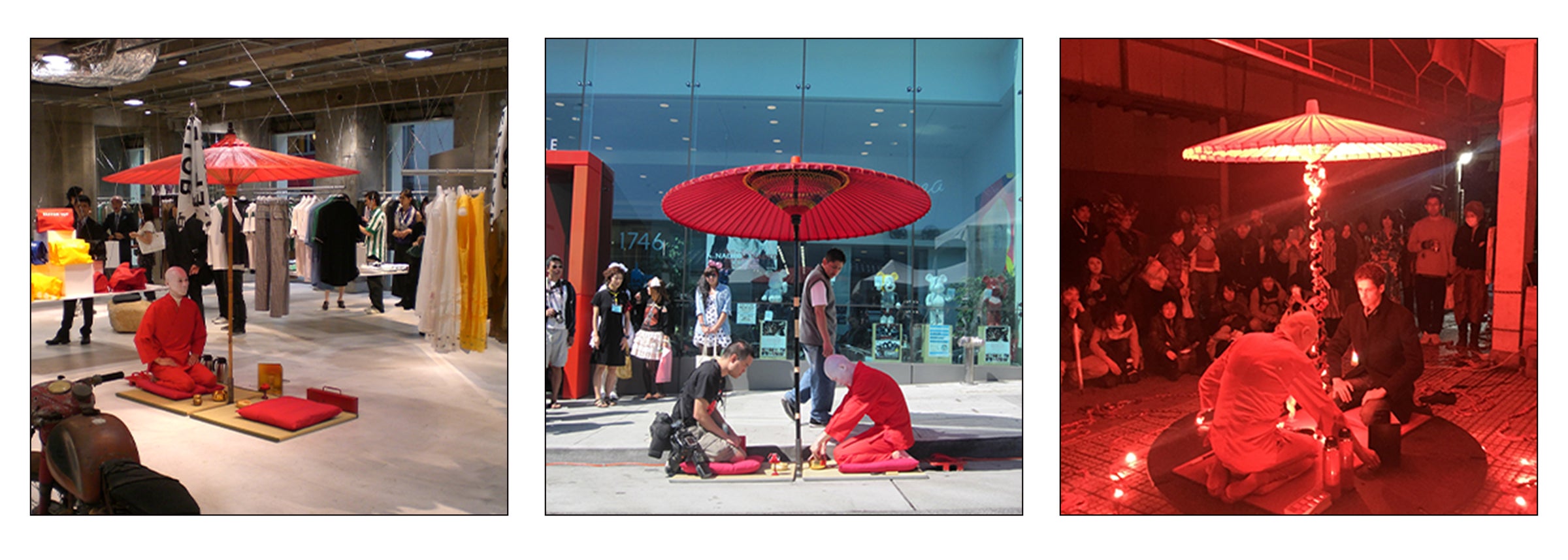たたみ一畳と赤い和傘、金の茶碗を携えて世界中の様々な場所で「茶会」を催すパフォーマンスで、国内のみならず、ニューヨーク、パリ、イスラエルなどで茶会を催し、中でも毎年8月にネバダ州の砂漠で行われるアートフェス「バーニングマン」では、フェスの模様を紹介する各国メディアにおいても、メインビジュアルとして取り上げられるなど、アイコン的な存在として知られています。