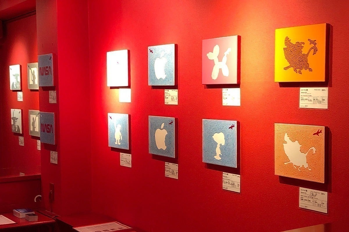「飛ぶ」をテーマにしたアートワーク「In-Flight Painting(IFP)」では、機内をアトリエに、雲を基本のモチーフにしつつ、そのフライトに所縁のあるキャラクターやランドマークを、浜崎特有の技法である迷路を用いて、1フライト1作品を制作しています。