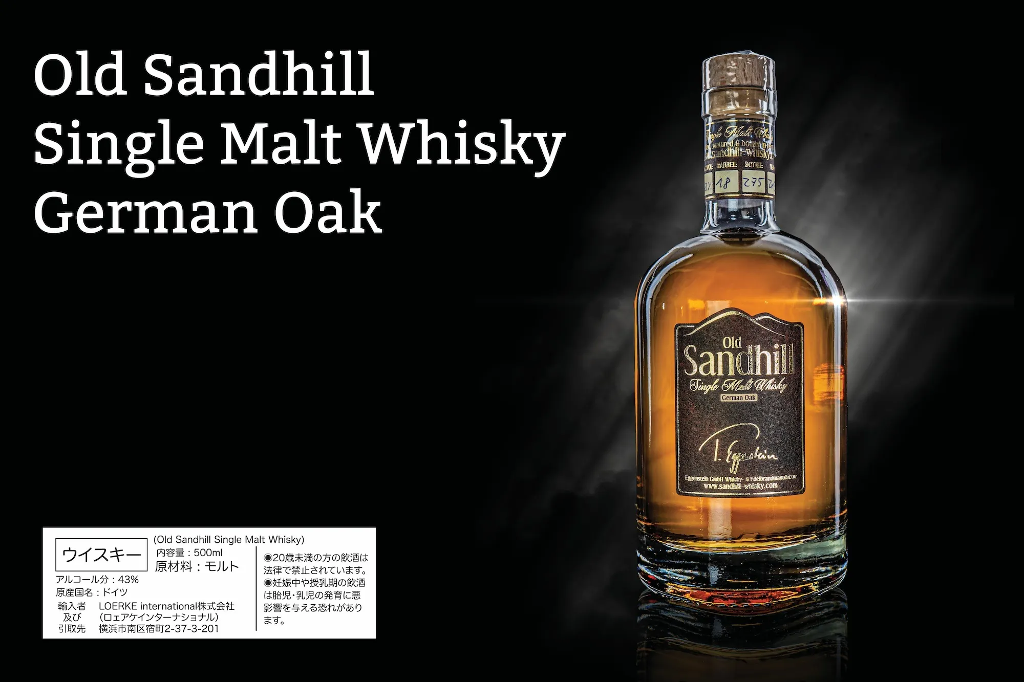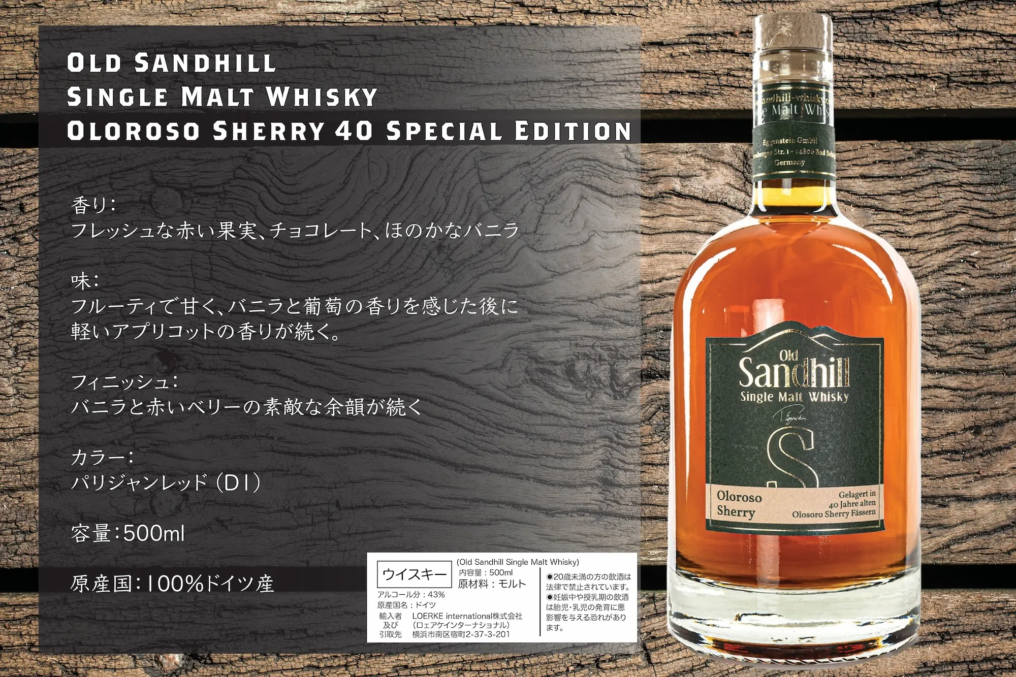 ①正規ルートでの販売は日本国内初となるドイツの「エゲンシュタイン蒸溜所」のウイスキー「オールド・サンドヒル・シングルモルトウイスキー/オロロソシェリー 40 スペシャル・エディション」の輸入