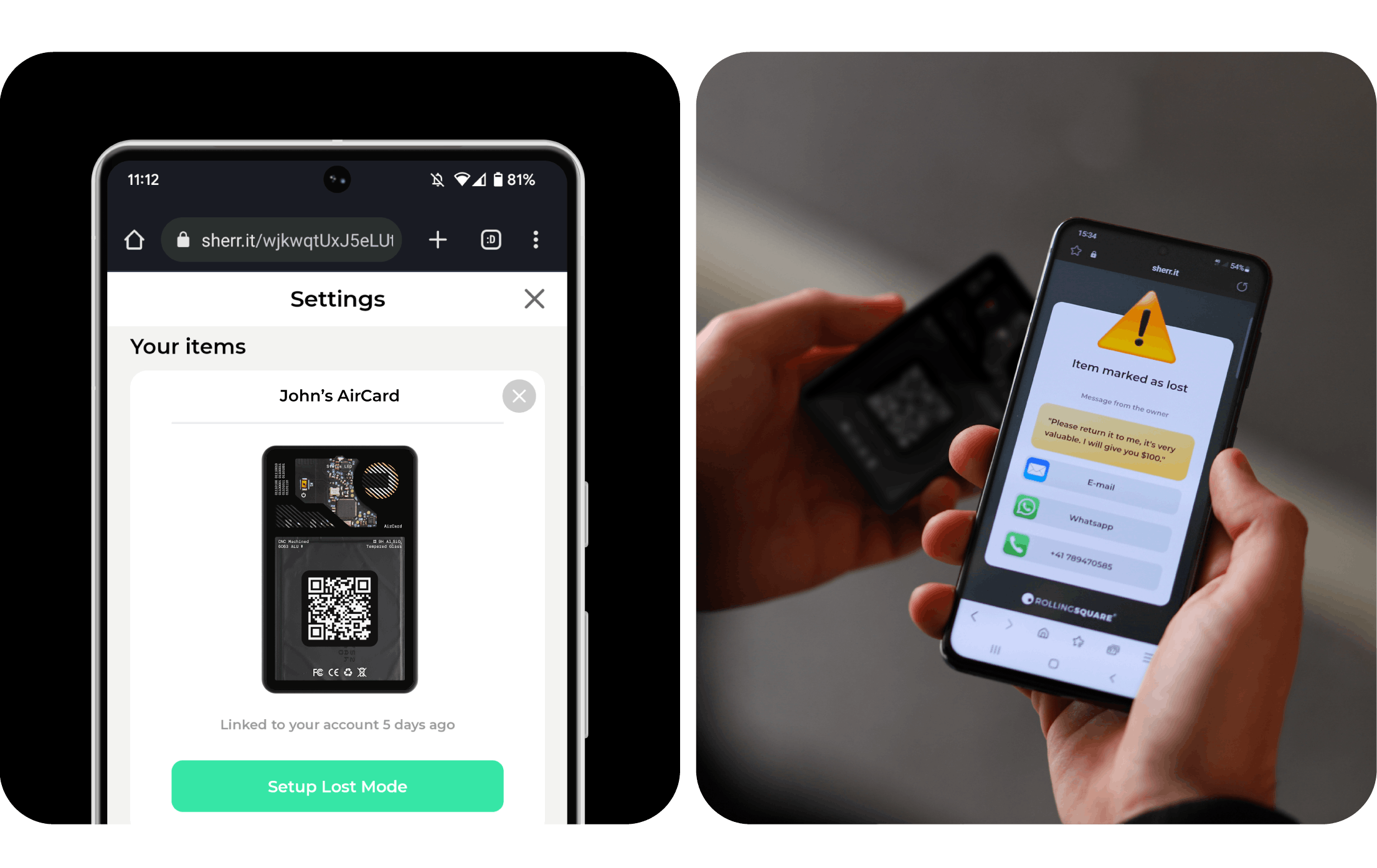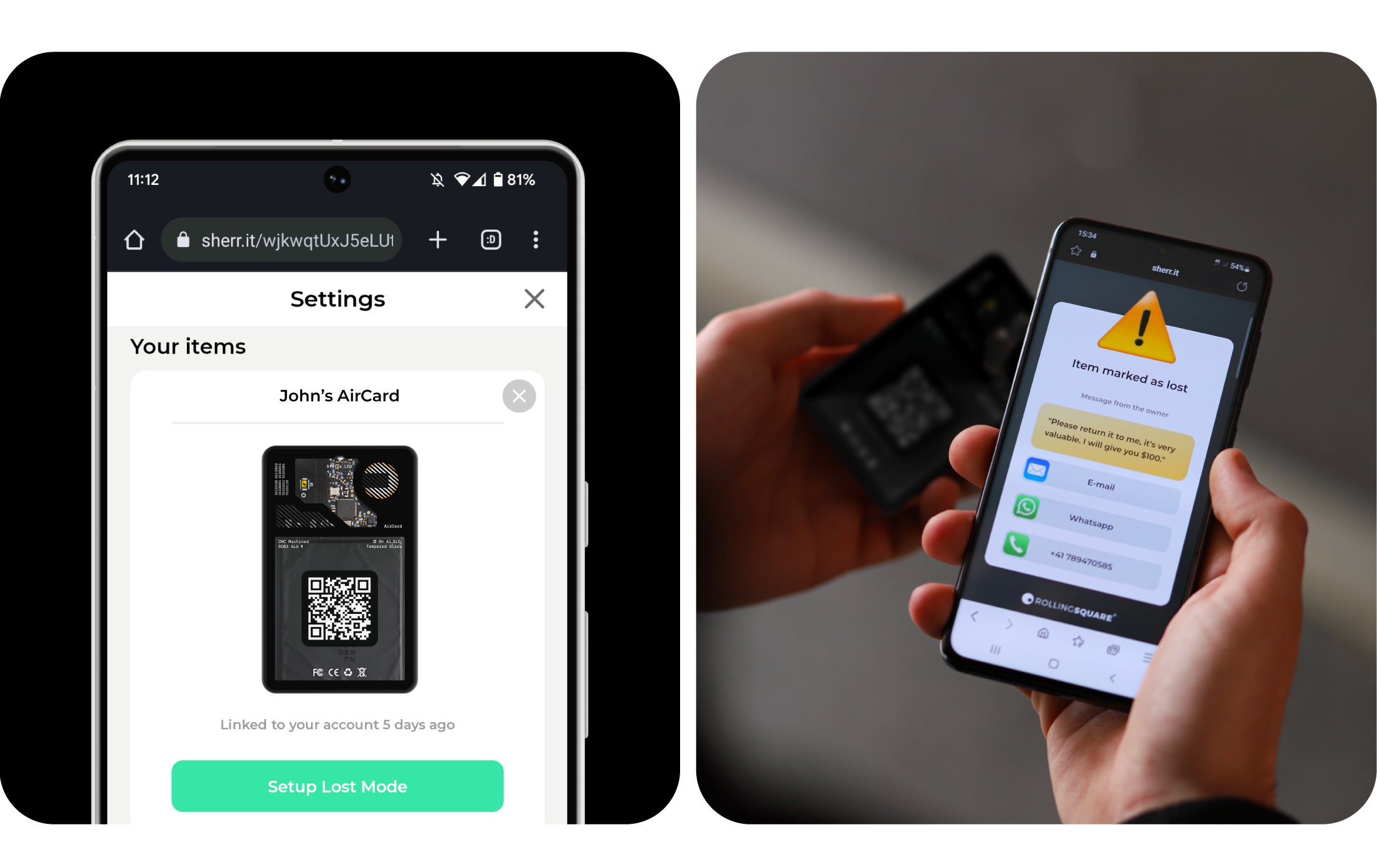 Rolling Squareが開発した「Sherr.itプラットフォーム」を通じて「高度な紛失モード」を有効化すると、AirCardのQRコードをスキャンするだけで、発見者はあなたの設定したメッセージや連絡先を直接スマートフォンで確認でき、すぐにあなたへの連絡が可能になります!