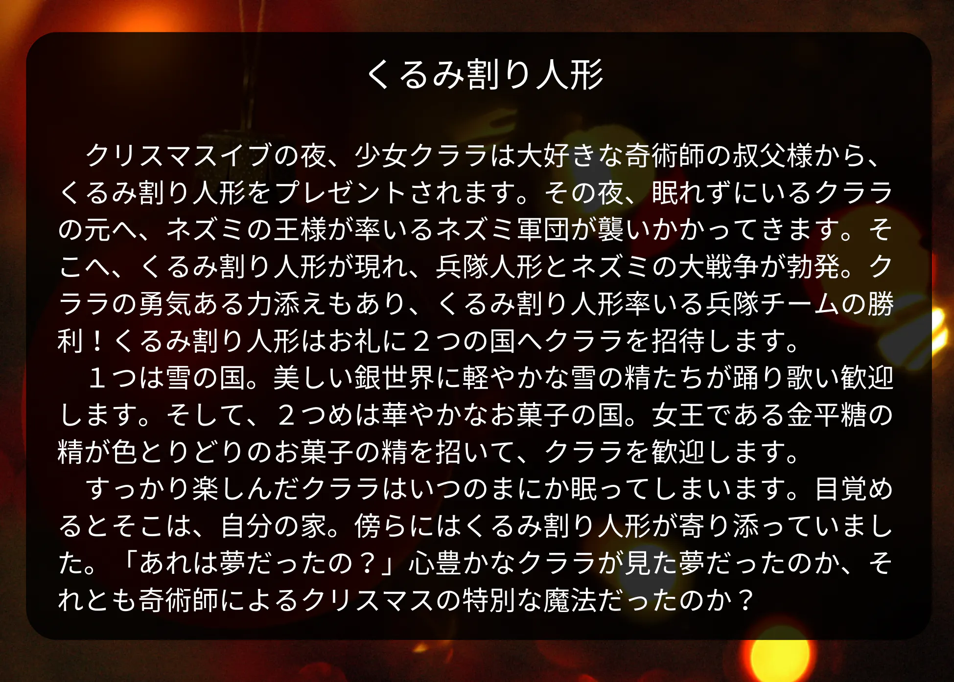 クラシック音楽の作曲家として、ベートーヴェンやバッハと並んで有名なチャイコフスキーによるバレエ音楽を使用した、クリスマスイブの夜をテーマにした作品です。皆さんがよくご存知の白い犬でお馴染み、お父さん犬が出てくる携帯電話会社のCM。ほっこりしたメロディーラインや繊細な音楽は、このくるみ割り人形から抜粋されたものです。また、クラシックバレエにおける「三大バレエ」と呼ばれる大作の1つでもあり、ヨーロッパをはじめ、世界の12月公演ではシーズナルステージとしても有名なバレエ作品です。