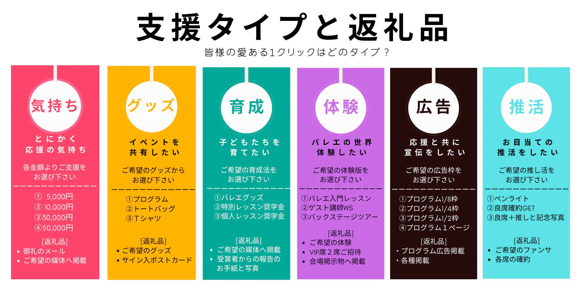ご支援いただく皆様へのお礼として、各種ご用意をしております。「気持ち」「グッズ」「育成」「体験」「広告」「推活」の6種類から、ご希望のご支援をお選び下さい。魅力的な返礼品はもちろん、様々な支援方法があるのも特徴です。
