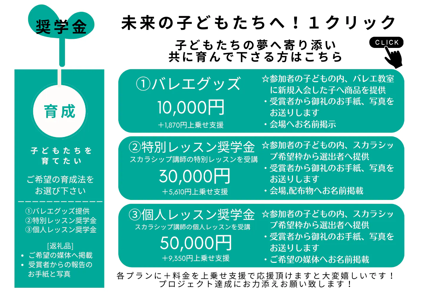 バレエ普及はもちろん、ひとりの大人として、今回のプロジェクトに人生の大きなターニングポイントを置いています。これまでは、自分の為、家族の為、生徒の為といった小さなコミュニティでの尽力でした。しかし、コロナ禍という未曾有の経験を経て、進みゆくデジタル社会の中、芸術分野は「ヒト」にしか出来ない才能であると再認識しました。「ヒト」が生み出す芸に対して、何かを感じることが出来るのもまた「ヒト」です。皆様のお力添え1つ1つが大きな波紋を呼ぶことはもちろん、これからの日本を豊かにする一石となりますことを心から御礼申し上げます。どうか、大切なその1クリックを私どもの働きの架け橋としてお願い致します。