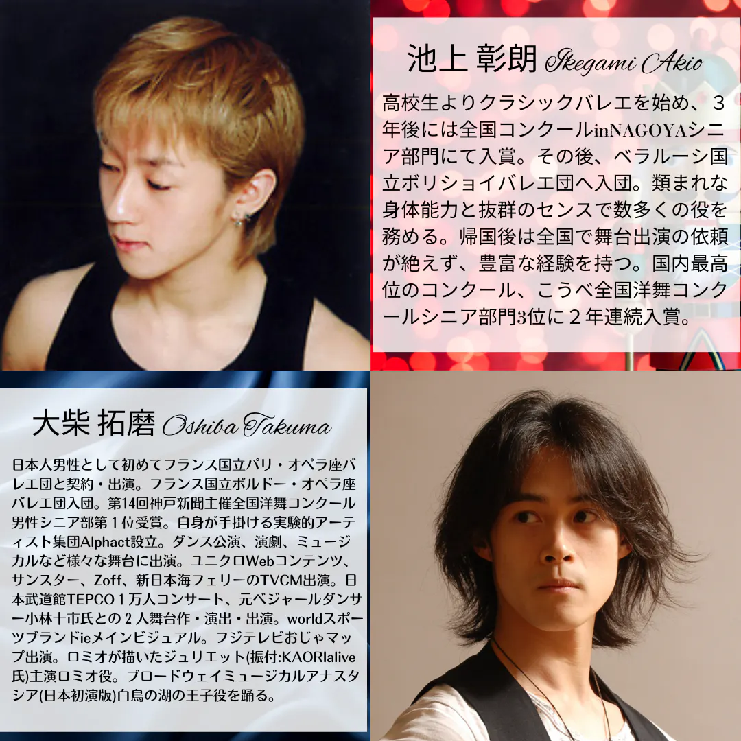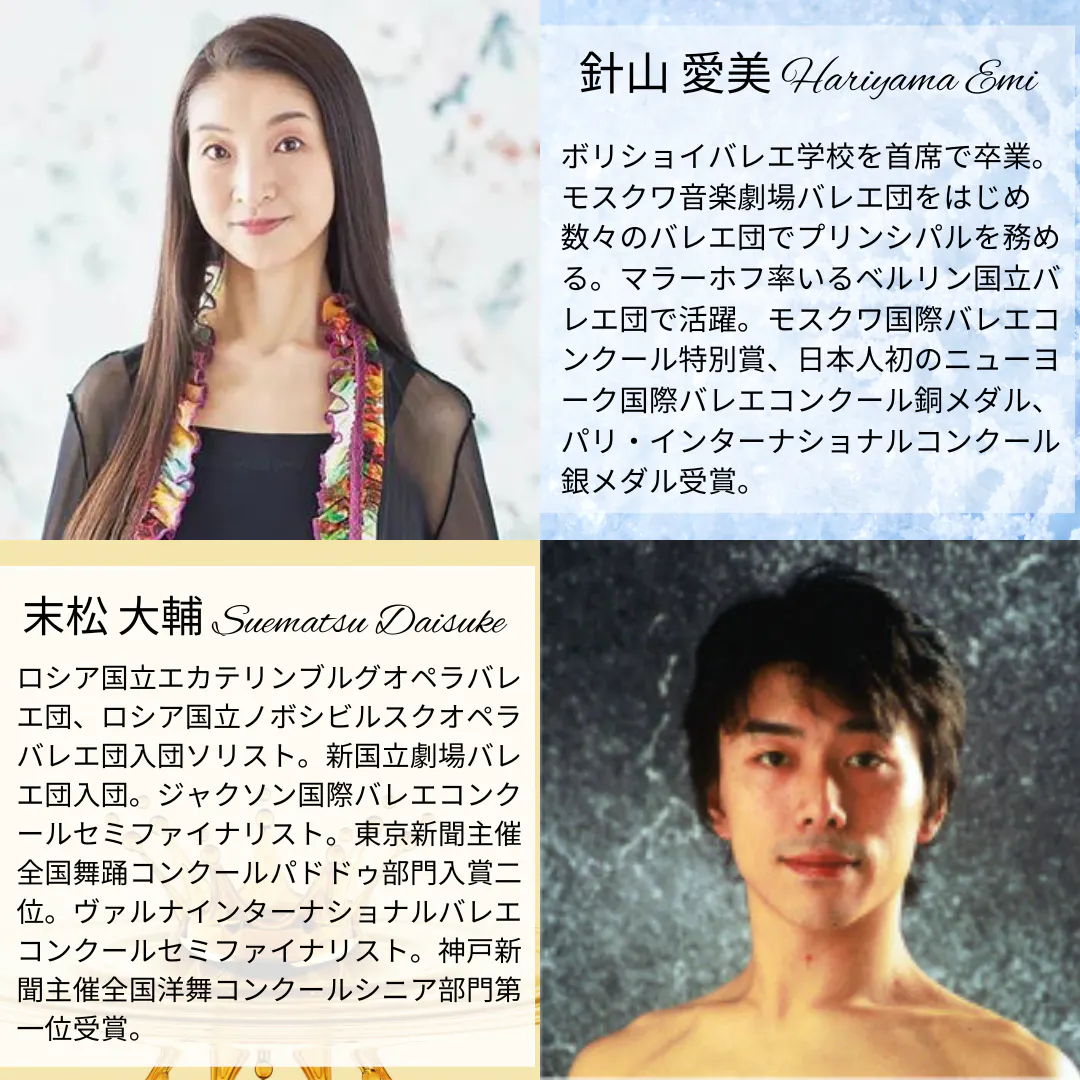 そんなプロフェッショナルダンサーですが、本公演にもご出演いただくことが決定しました。国内外のバレエコンクールで数々の賞を受賞され、世界の舞台で活躍してきた経験と帰国後の豊富な舞台実績をもつ方々です。出演者にとって、間近にプロフェッショナルダンサーの皆さまを感じることや、共演する機会は大きな財産となります。この貴重な経験を得ることが出来る舞台に賛同して下さった4名の素晴らしいダンサーをご紹介致しましょう。