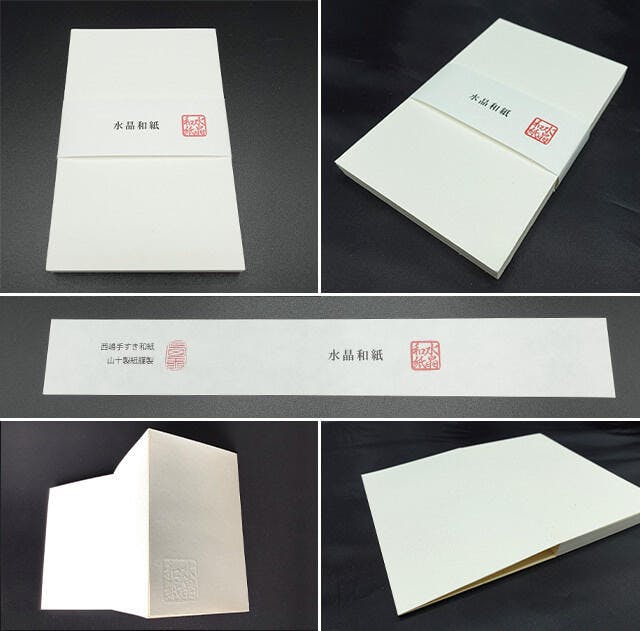 「水晶和紙」の手漉き和紙は、四百年以上の歴史を持つ、山十製紙の職人さんが幾重にもわたる手漉きの行程で、一枚一枚丹念に、手作業で仕上げた貴重な手漉き和紙で謹製されております。