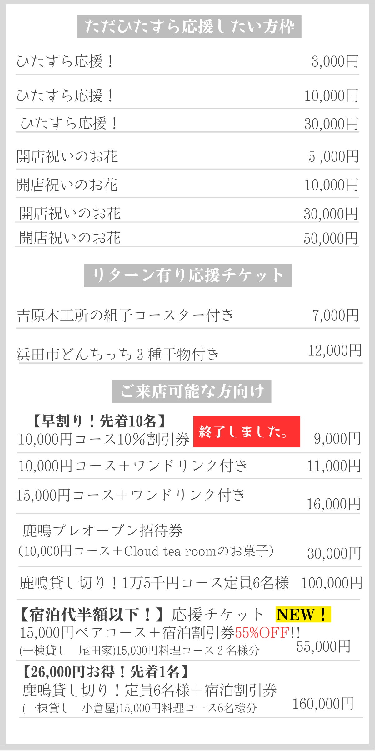 2024/06/17 09:03施工が始まり、いよいよオープンに向けて準備が始まったなと、わくわくしている今日この頃です。完成が6月26日を予定しております。さて、表題の件ですが開店祝いのお花をご支援頂いた方へ、お店のお花の飾り方について説明させていただきます。色々と悩みましたが、一般的な方法の開店時にお花を一度に飾る方法も考えましたが、鹿鳴は1日の利用客が少ないですし、店舗の前の人通りがあるわけでないため、せっかく頂いたお花が特定の人の目にしか触れないのも勿体ないかなと思ました。そういった思いで思いついたのが、1年間で開店祝いのお花を飾る方法です。(月に2~3人の支援者の方のお花を飾るようになるかと思います。)そして、インスタでご案内できたらいいなと思っております。インスタ投稿の前に、登録していただいたメールにお花の画像を送ります。ご支援の際にお花に飾る名前を記載していただきましたが、インスタで名前を載せても【可】もしくは【不可】を教えて頂けたらと思います。お花の打ち合わせをしている最中ですが、とても素敵なお花をオーダーできそうな予感がしています。お楽しみに…♪ もっと見る